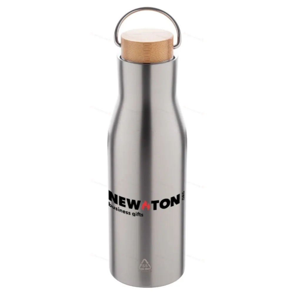 Двухстенная, переработанная нержавеющая стальная изолированная вакуумная фляга с крышкой для переноски из бамбука, 500 мл.