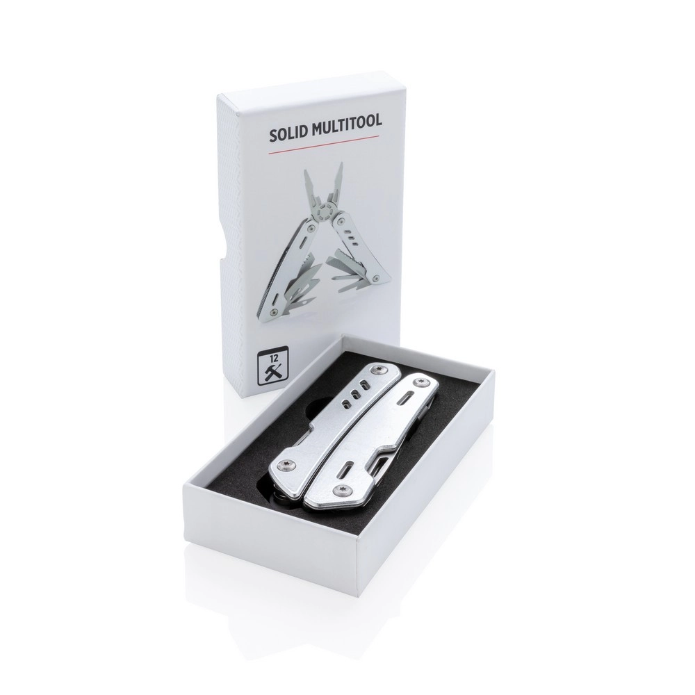 Прочный и долговечный мультитул с 12 функциями. Оснащен алюминиевым корпусом и инструментами из нержавеющей стали. Включает в себя: плоскогубцы с узкими губками, обычные плоскогубцы, кусачки для проволоки, нож, крестовую отвертку, маленькую плоскую отвертку, пилу, открывалку для консервов, открывалку для бутылок, серрейторный нож, шило/пробойник, напильник и большую плоскую отвертку. Упакован в подарочную коробку.