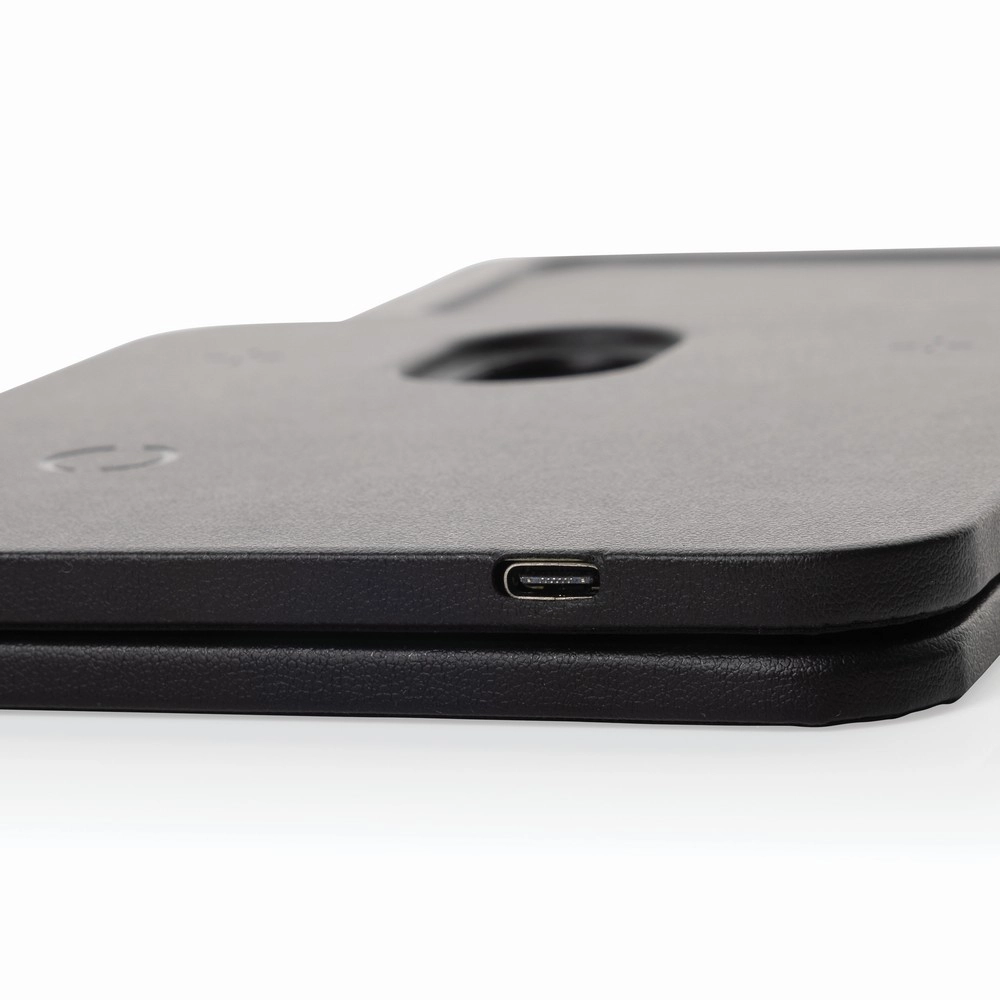 Роскошное и складное беспроводное зарядное устройство 3-в-1 с подставкой для стола, изготовленное из переработанной PU кожи с использованием технологии RCS. Общий процент переработанных материалов: 5% от общего веса изделия. Сертификация RCS гарантирует полностью сертифицированную цепочку поставок переработанных материалов. Беспроводное зарядное устройство оснащено магнитным зарядным устройством мощностью 15 Вт и дополнительным зарядным устройством мощностью 5 Вт, подходящим для зарядки чехлов для наушников или других небольших устройств с поддержкой беспроводной зарядки, а также зарядным устройством мощностью 2,5 Вт для смарт-часов (только для Apple Watch). В комплект входит кабель TPE длиной 120 см. Упаковано в упаковку с сертификатом FSC® mix. Изделие и аксессуары не содержат ПВХ. Минимальный вход: 9В/3А для оптимального использования. Выход: Телефон: 9В/1.1А; 9В/1.67А/(15Вт), Наушники: 5В/1А (5Вт), Часы: 5В/0.5А.