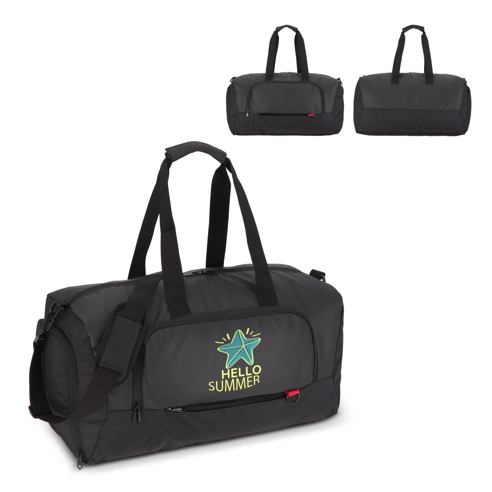 Сумка на выходные изготовлена из жаккарда и ПУ-покрытого материала 600D. В ней есть боковое карман для обуви, просторный передний карман и скрытый передний карман. В комплекте идут регулируемые, съемные плечевые ремни, ручки для переноски, подкладка из материала 210D и два внутренних кармана для аксессуаров.