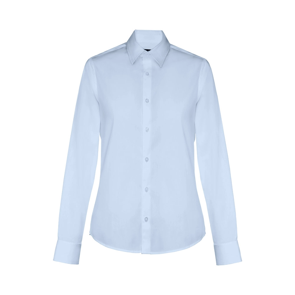 Женская рубашка с длинными рукавами, выполненная из 68% хлопка, 28% полиамида и 4% эластана (115 г/м²). Длинные рукава с одной складкой и манжетами на одной пуговице. Приталенный крой с двумя вытачками на спине и планкой с семью пуговицами в тон. Доступные размеры: S, M, L, XL, XXL.