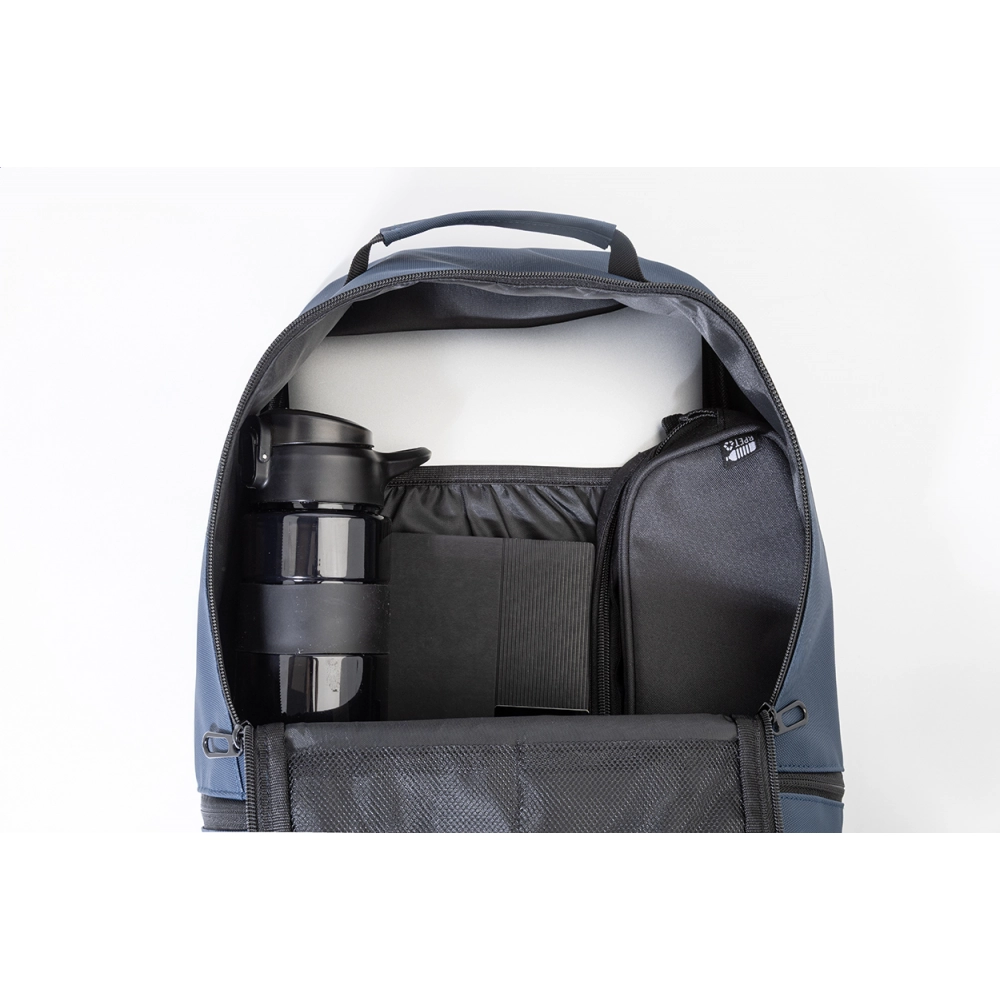 Водонепроницаемый рюкзак из RPET с застежкой на молнии, подкладкой для ноутбука (13 дюймов), нижним отделением на молнии и скрытым боковым карманом. С мягкой спинкой и плечевыми ремнями. Покрытый ПУ 600D RPET полиэстером, с характерным ярлыком RPET.