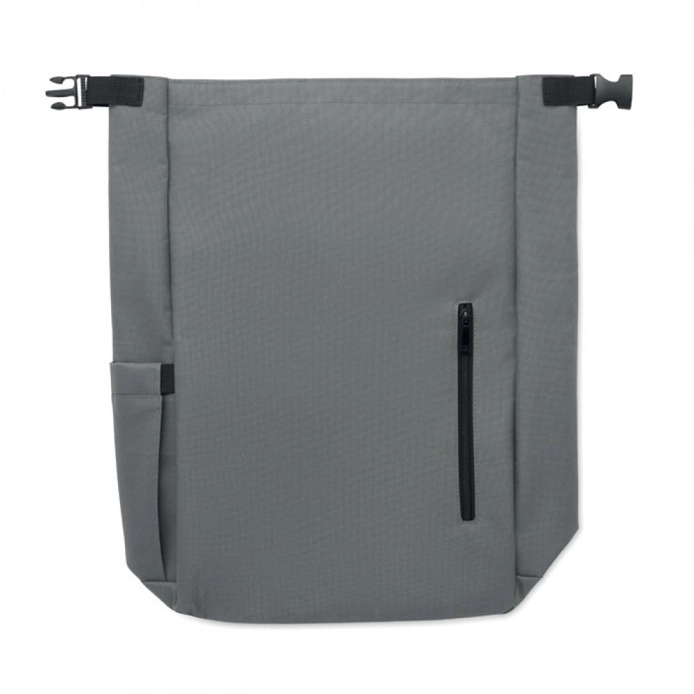 15-дюймовый рюкзак для ноутбука с закручивающимся верхом, изготовленный из полиэстера 600D RPET с мягкой подкладкой из 210D RPET. Оснащен передним карманом на молнии, эластичным боковым карманом и регулируемыми плечевыми лямками.