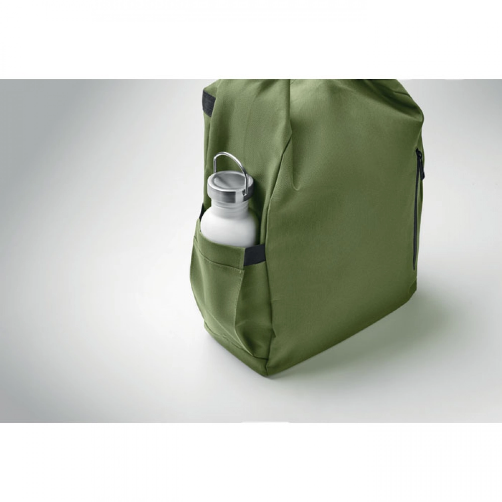 15-дюймовый рюкзак для ноутбука с закручивающимся верхом, изготовленный из полиэстера 600D RPET с мягкой подкладкой из 210D RPET. Оснащен передним карманом на молнии, эластичным боковым карманом и регулируемыми плечевыми лямками.