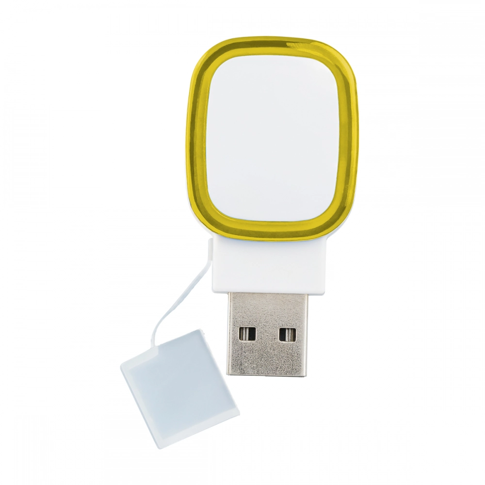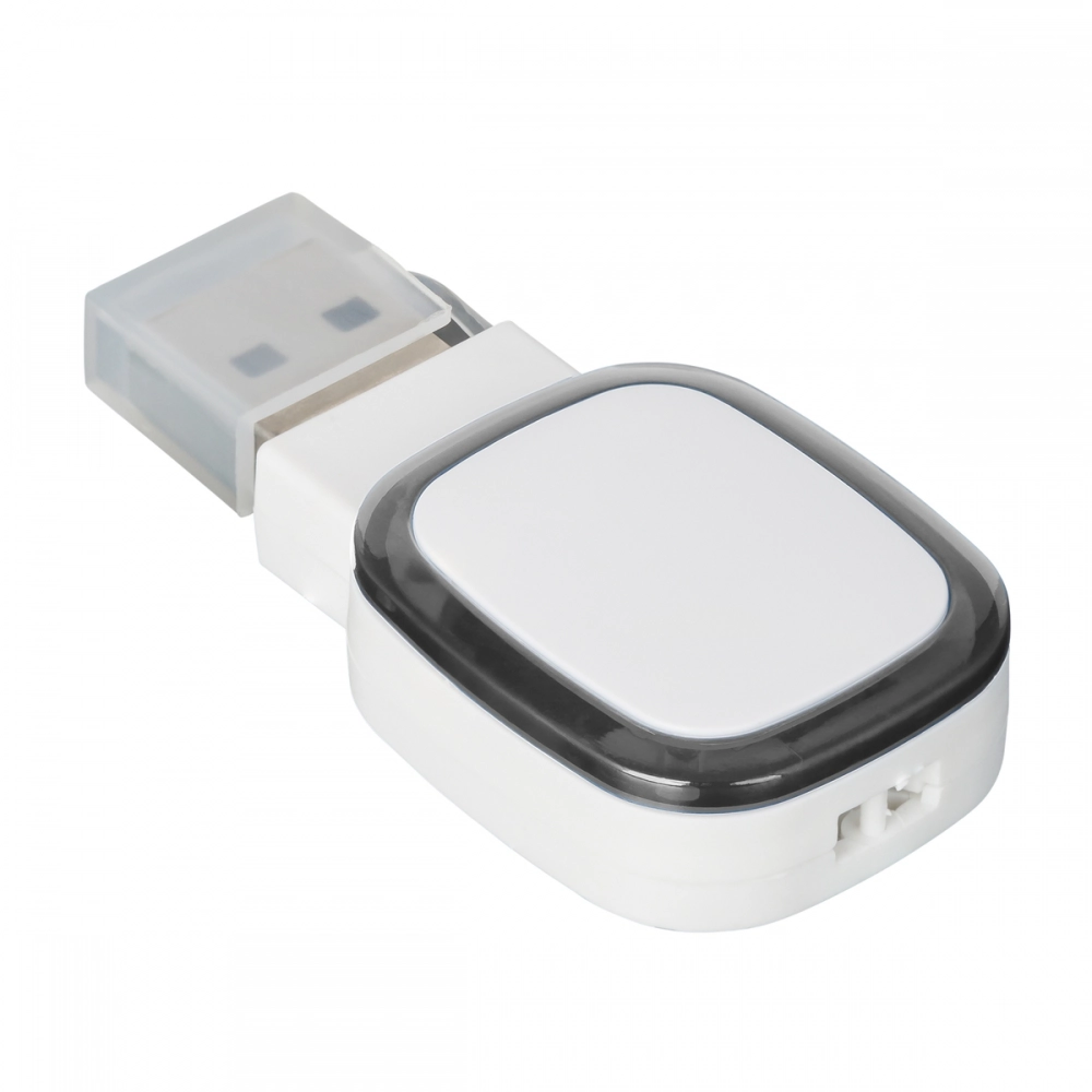 This unique USB flash drive with USB 2.0 is available from stock with either 4, 8 or 16 GB capacity. Higher capacities are available on request. The colour ring around the logo plate is illuminated by LED backlight.