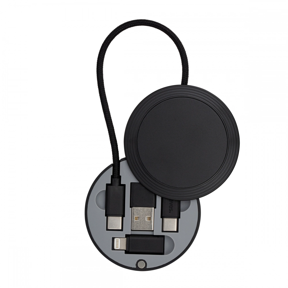 This 4-in-1 cable set is a smaller and lighter evolution of the REEVES-myConvertics. The charging and data cable with up to 60 watts offers particularly high charging comfort. The cable set is made from recycled ABS, TPE, PET plastics and recycled aluminium. The compact box contains a USB-C to USB-C cable, a USB-A adapter, and an 8 Pin adapter for Apple®. The housing can be easily opened by sliding it sideways and securely closed thanks to the magnetic closure.