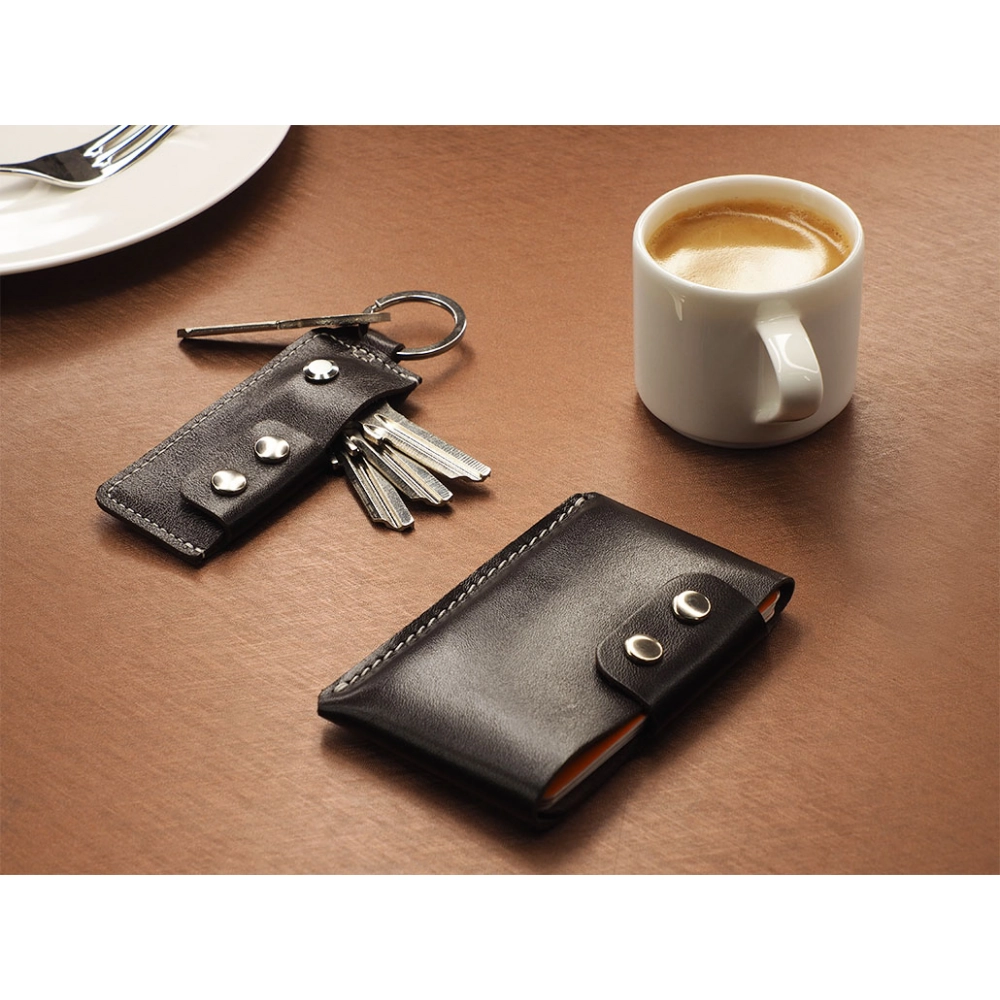 Wallet and key ring set. Banknote pocket. Coin pocket. Holds 3 keys. Holds 8 cards. Registered design ®. 2 snaps fastening. Contains leather keyring. Includes leather wallet. Paper box included