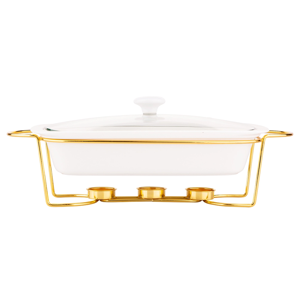 Regular rectangular serving dish 1,7 L on golden warming stand