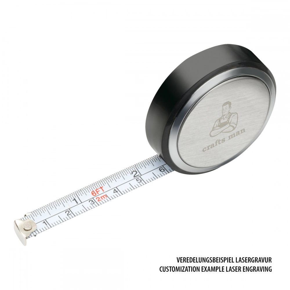 Practical metal self-retracting tape measure with metric and imperial (feet) units. The tape measure is 2 meters long. The case is made of black plastic and silver metal. The case can be customised with doming, laser engraving, UV printing or one to four colour pad printing.