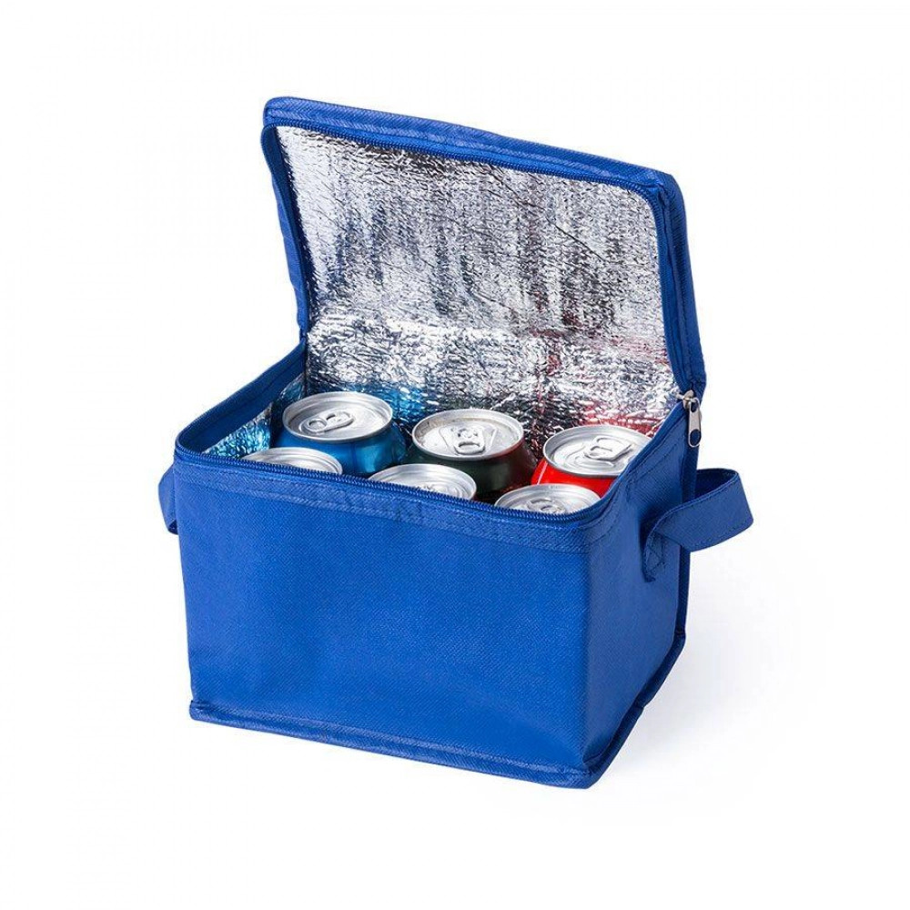 Cooler bag for 6 cans made of durable non-woven material. Inside with aluminum coating. With zipper closure and handle for carrying in matching color.