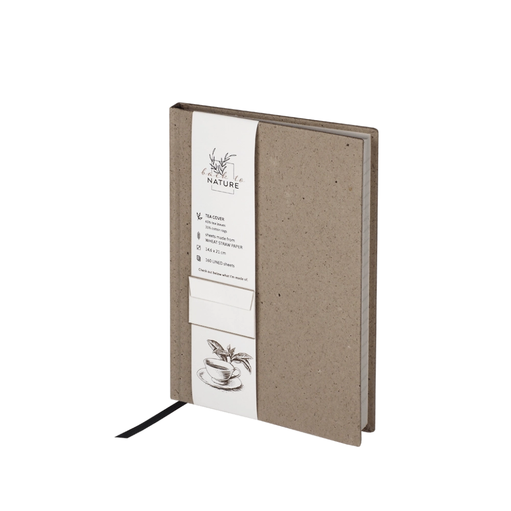 Блокнот из переработанного чая. Бумага из соломы пшеницы. Прикреплен образец переработанного материала. 80 линованных листов.