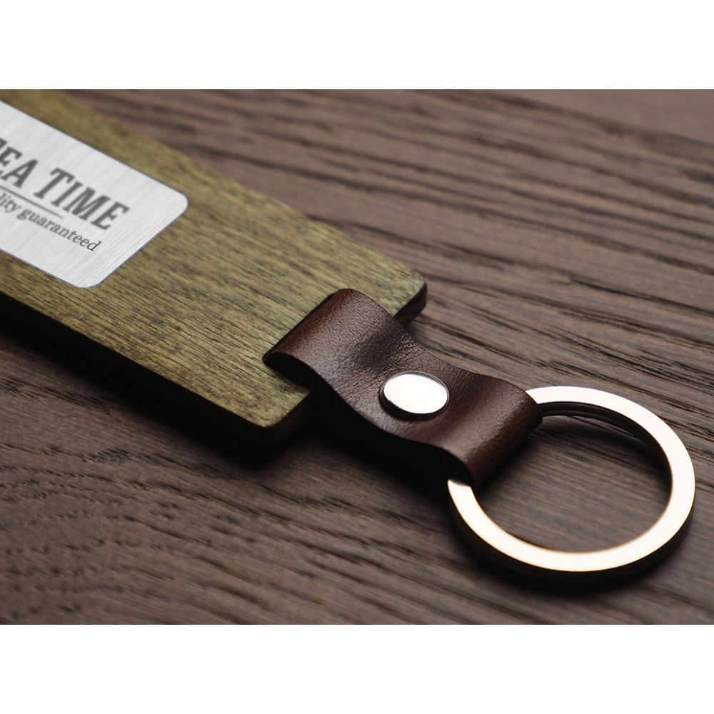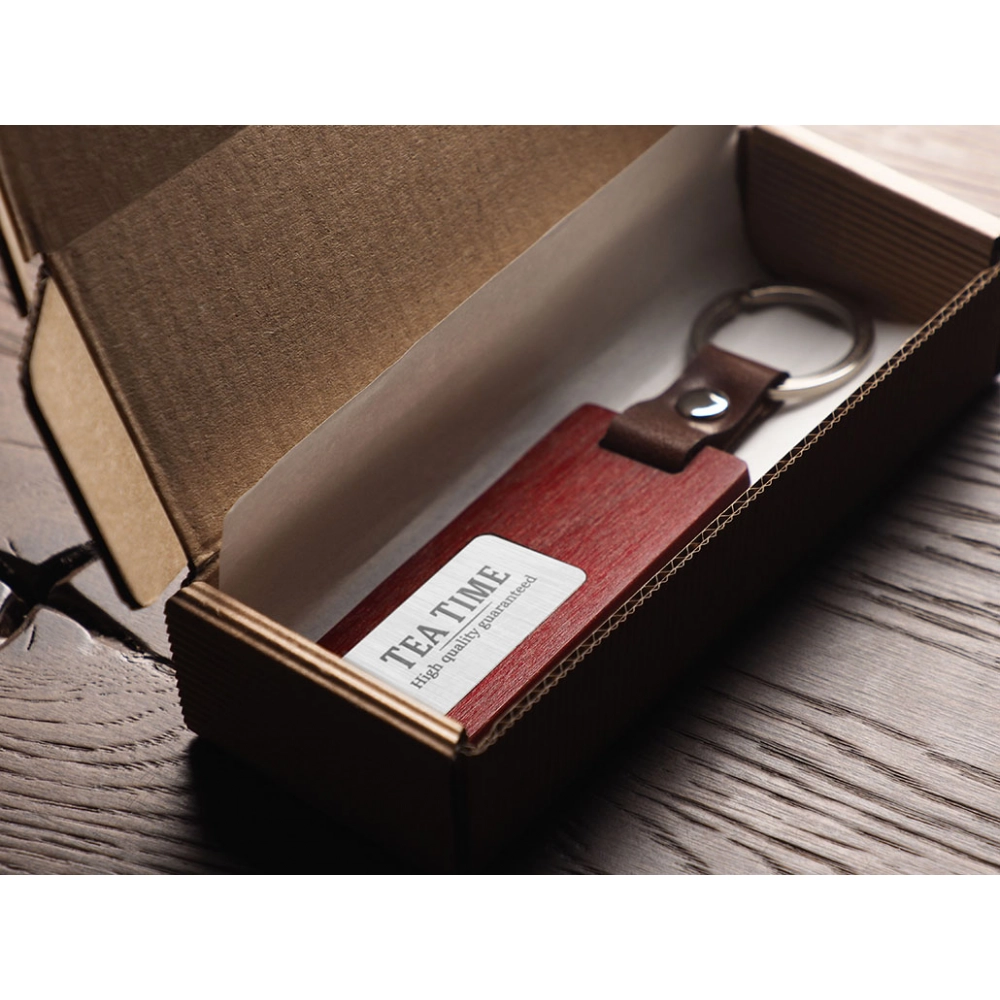 Деревянный брелок. Имеет металлическую пластину для логотипа. В комплект входит картонная коробка.
