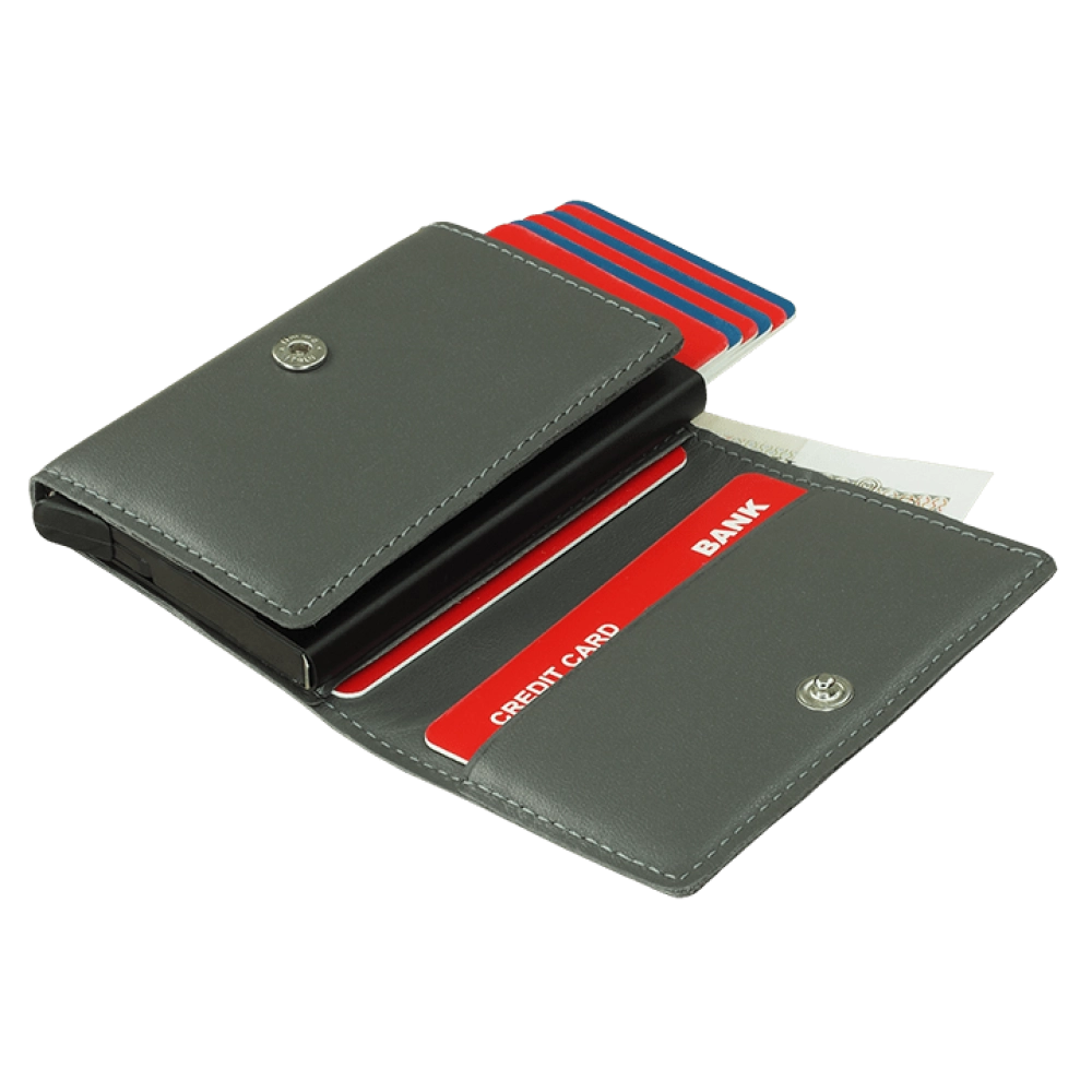 Кошелек с RFID-защитой. Отделение для банкнот. Вмещает 10 карт. Зарегистрированный дизайн ®. Защита от считывания RFID. Застежка на кнопке. В комплекте картонная коробка.
