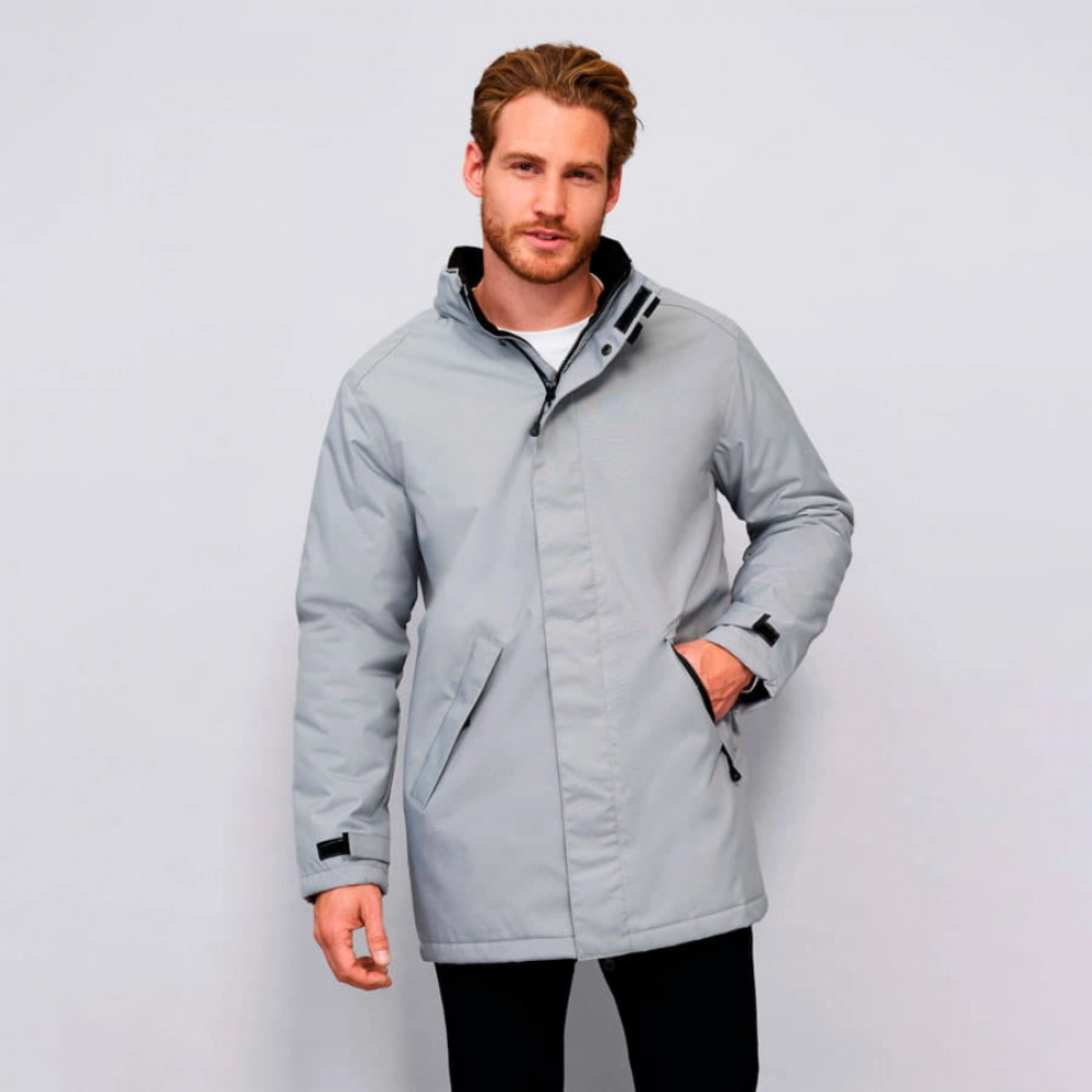 Куртка-парка унисекс на стеганой подкладке ROBYN 170 Основная ткань «оксфорд»: 100% полиэстер с водоотталкивающей пропиткой Стеганая подкладка: 100% полиэстер Утеплитель: 100% полиэстер, 170 г м2 Температурный режим определяется в зависимости от индивидуальных особенностей человека. Куртка на тонком утеплителе рассчитана на евро-зиму (от 0 до -10 С) Стильная теплая парка унисекс прямого кроя станет необходимой в промозглое осенне-зимнее время года. Благодаря пропитке ПВХ - (PVC) поливинилхлорид, ткань полностью прорезинена внутри, что делает ее водонепроницаемой и формоустойчивой. Куртка на застежке-молнии с двумя пуллерами для удобства открытия и планкой на скрытых кнопках надежно убережет от попадания ветра и влаги. Внутренняя планка на верхней части куртки обезопасит от прищемления молнией при закрытии. Высокий воротник- стойка (7 см) с внутренней стороны отделан флисом для мягкости и комфорта, а снаружи прячет в себя капюшон на кулиске с резинкой и стопером. Капюшон без утеплителя всегда можно легко достать и разложить, если погода резко испортится, а потом также убрать. Длинные рукава с утеплителем внутри и на застежке-липучке помогут сохранить тепло. 2 внешних кармана на молнии и один внутренний на застежке-липучке уберегут небольшие предметы от намокания. Изнутри на стеганной подкладке внизу имеется технологический карман для удобства персонализации. Упакована куртка в прозрачный фирменный пластиковый пакет Sol's. Цвет близкий к PANTONE Cool gray 11C