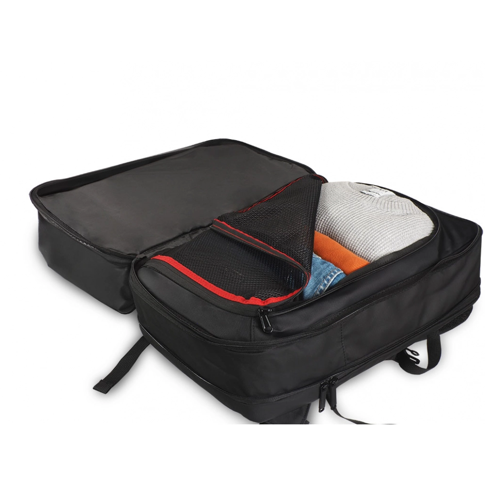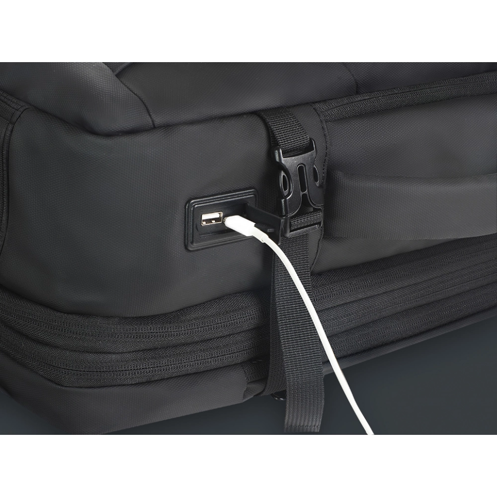 Рюкзак для ручной клади. 2 ручки. 2 сетчатых кармана. 4 кармана для ручек. 6 карманов для документов. 6 карманов на молнии. Карман для ноутбука 15". Крепежный ремень для ручки чемодана. Полное открытие для удобной упаковки (180°). Регулятор объема. Внешний USB-порт для зарядки.