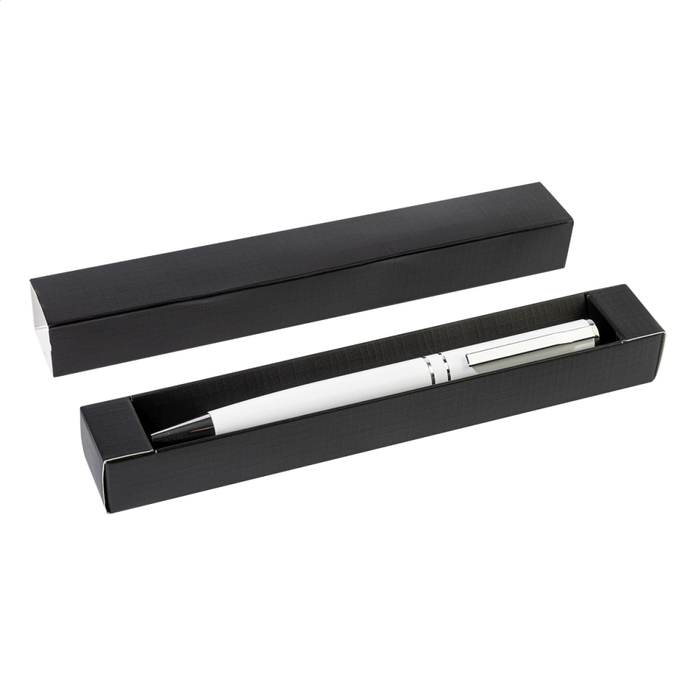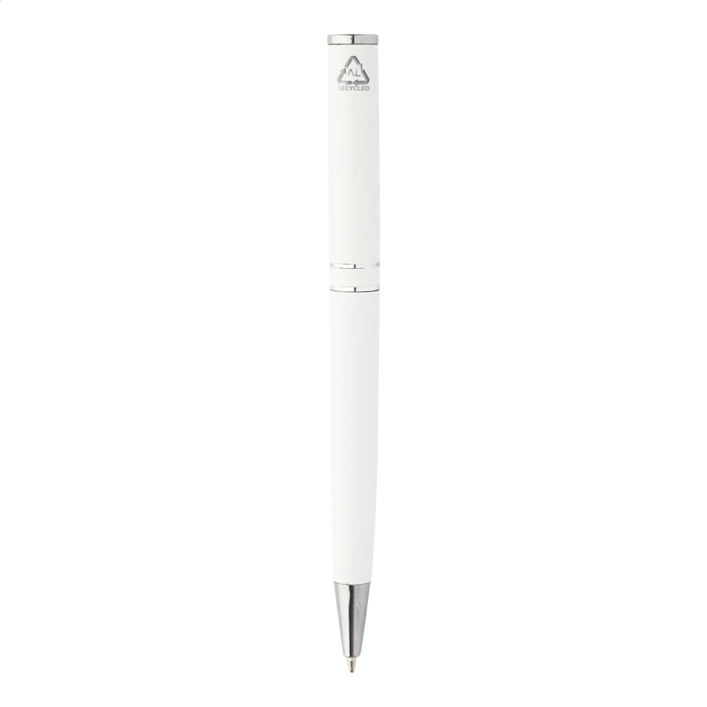 Переработанная алюминиевая шариковая ручка с хромированными деталями и кольцами. В черной подарочной коробке. С синим запасным стержнем.