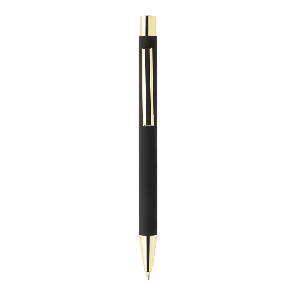 Шариковая ручка из переработанного алюминия с черным резиновым корпусом и цветными блестящими металлическими отделками. Специальное покрытие для зеркальной гравировки, соответствующей металлическим деталям. С синим стержнем.