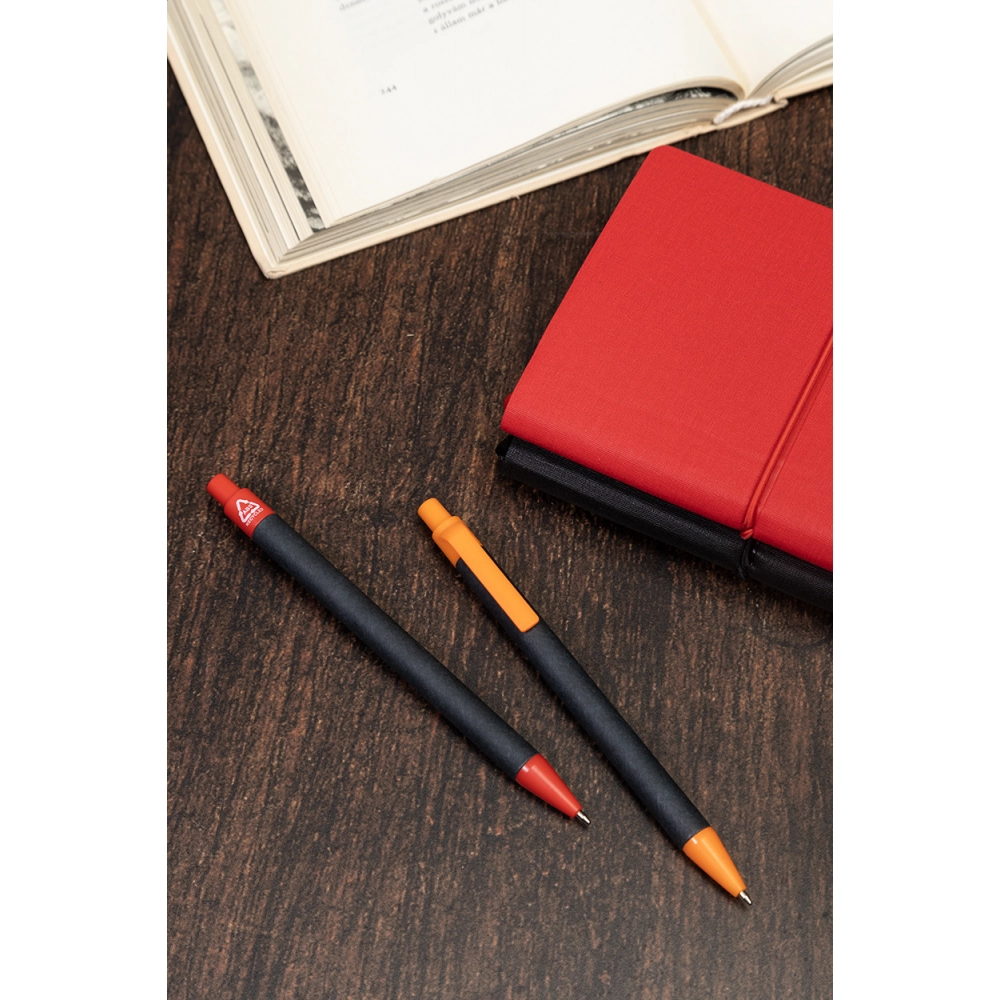 Шариковая ручка из переработанной бумаги с черным корпусом и деталями из переработанного ABS. С синим стержнем.