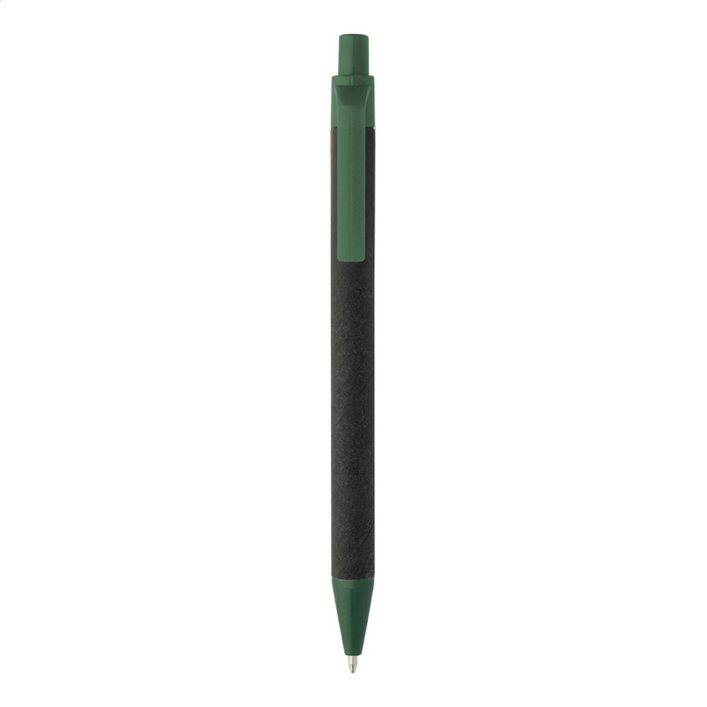 Шариковая ручка из переработанной бумаги с черным корпусом и деталями из переработанного ABS. С синим стержнем.