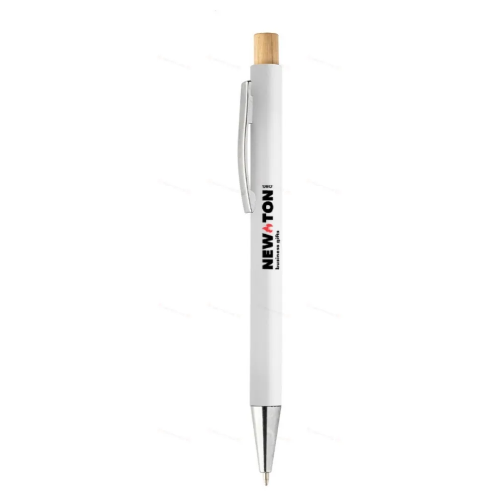 Шариковая ручка из переработанного пластика ABS с кнопкой из бамбука и металлическим зажимом. С синим стержнем.