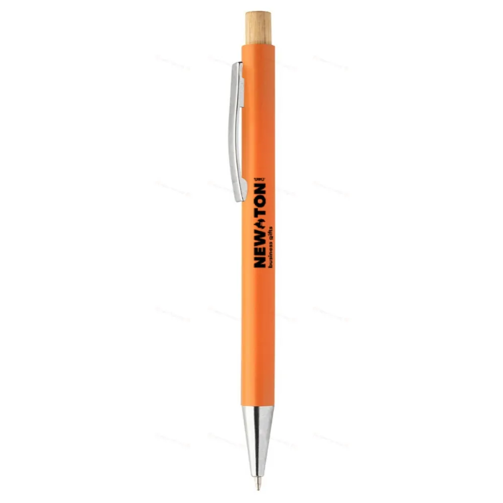 Шариковая ручка из переработанного пластика ABS с кнопкой из бамбука и металлическим зажимом. С синим стержнем.