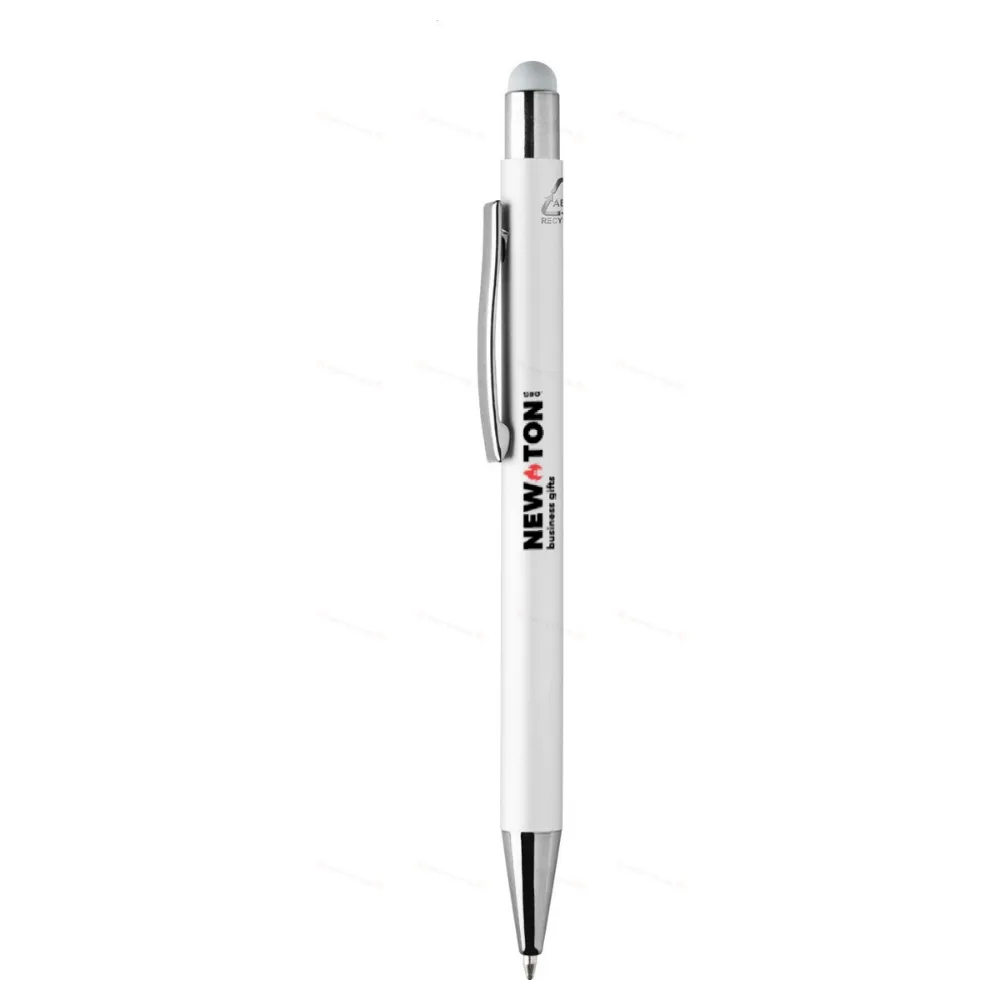 Шариковая ручка и стилус из переработанного алюминия с резиновым корпусом и цветными блестящими металлическими отделками. Специальное покрытие для зеркальной гравировки, соответствующей металлическим деталям. С синим заправочным стержнем.