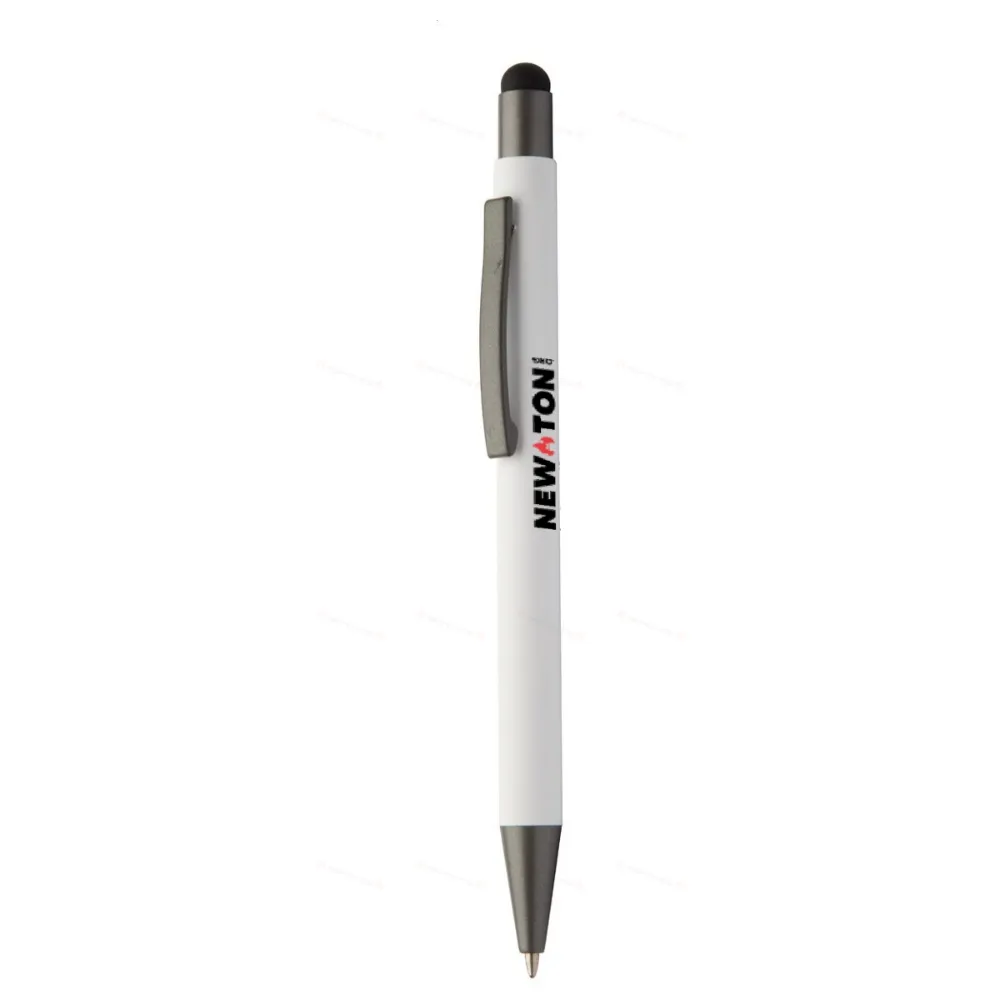 Шариковая ручка и стилус из переработанного алюминия с резиновым корпусом и деталями с покрытием из гантельного металла. С синим заправочным стержнем.