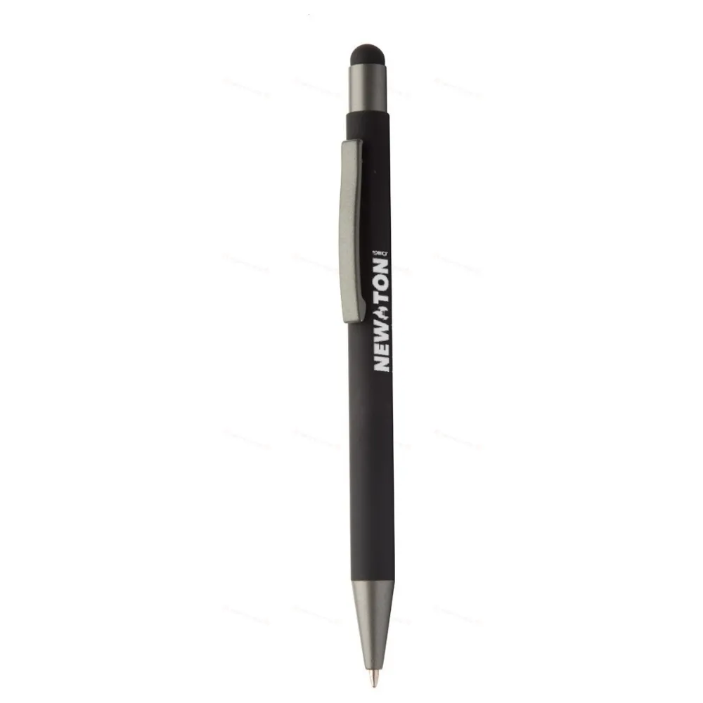 Шариковая ручка и стилус из переработанного алюминия с резиновым корпусом и деталями с покрытием из гантельного металла. С синим заправочным стержнем.
