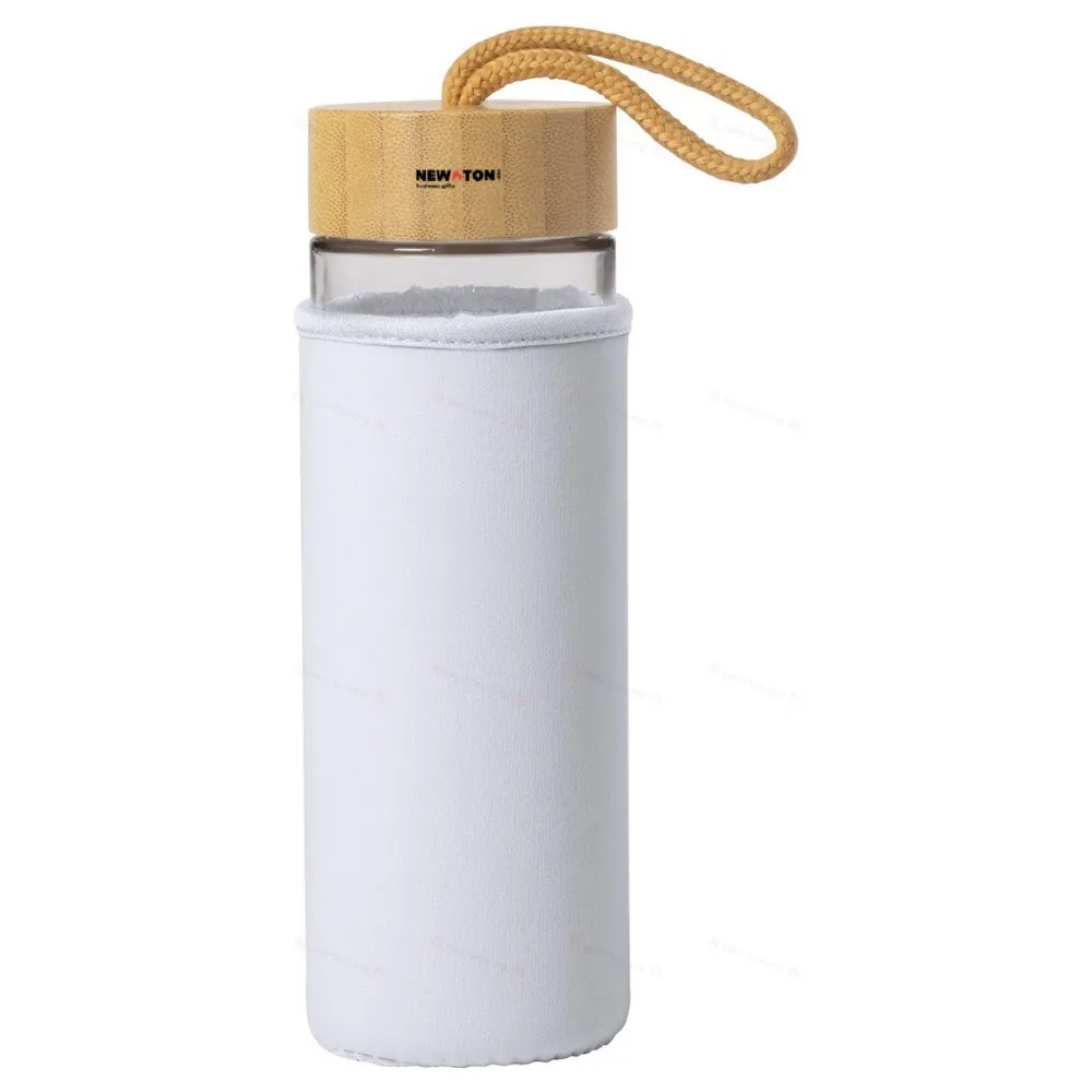 Стеклянная спортивная бутылка с бамбуковой крышкой и крышкой из белого неопрена, 530 мл.