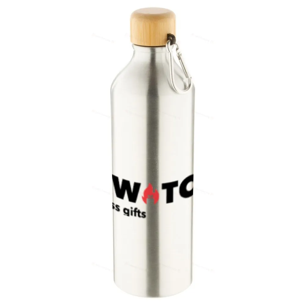Алюминиевая спортивная бутылка с бамбуковой крышкой и карабином, 800 мл.
