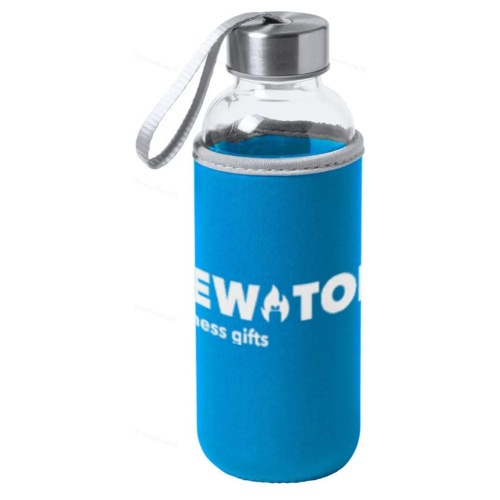 Стеклянная спортивная бутылка с ремешком для переноски на крышке и цветной неопреновой крышкой. 420 мл. Не подходит для газированных напитков.