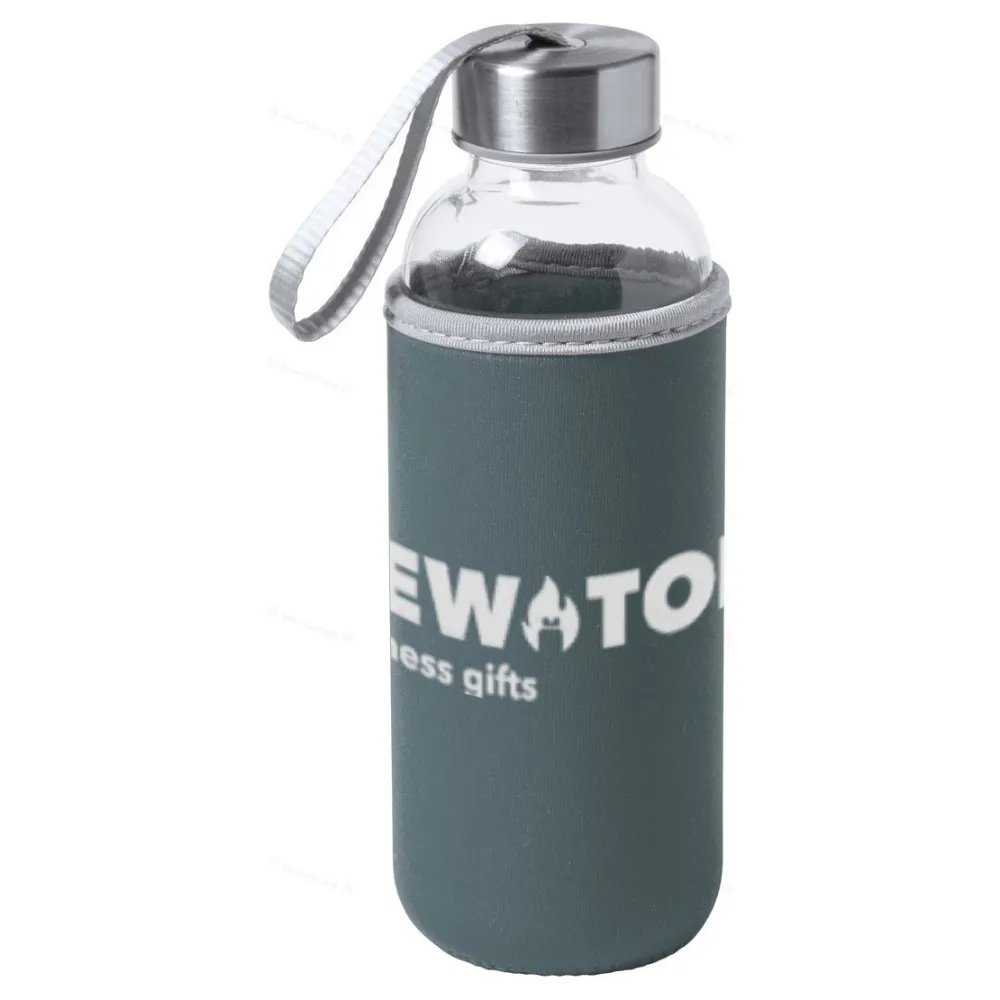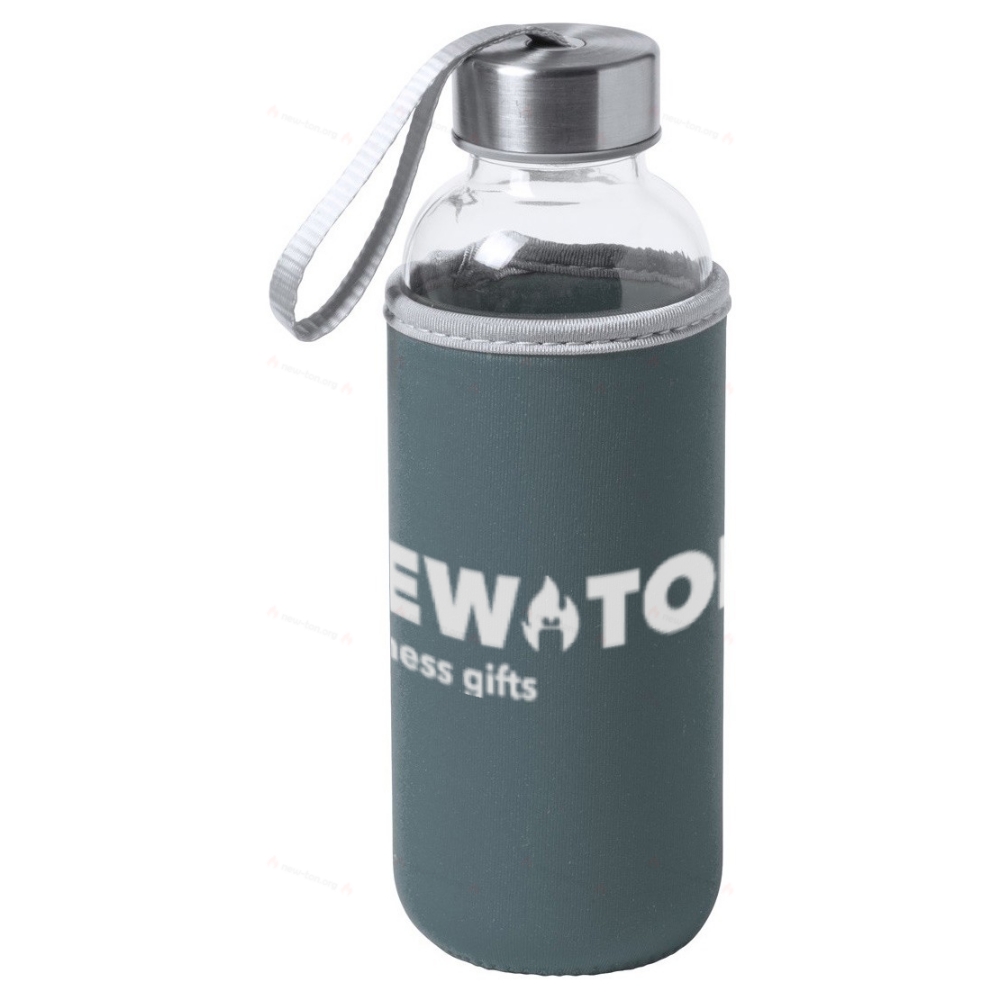 Стеклянная спортивная бутылка с ремешком для переноски на крышке и цветной неопреновой крышкой. 420 мл. Не подходит для газированных напитков.