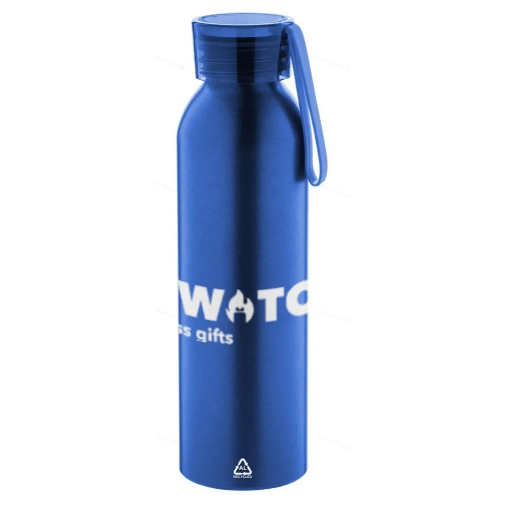 Переработанная алюминиевая спортивная бутылка с крышкой в соответствующем цвете и силиконовым ремешком для переноски, 600 мл.