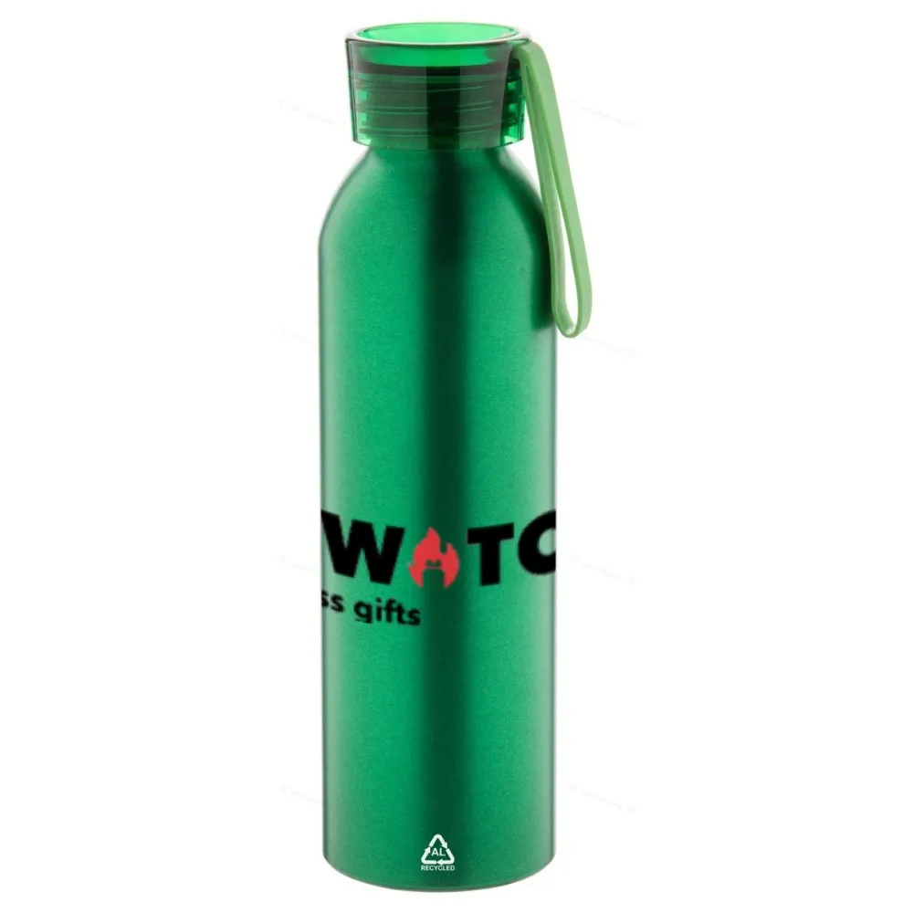 Переработанная алюминиевая спортивная бутылка с крышкой в соответствующем цвете и силиконовым ремешком для переноски, 600 мл.