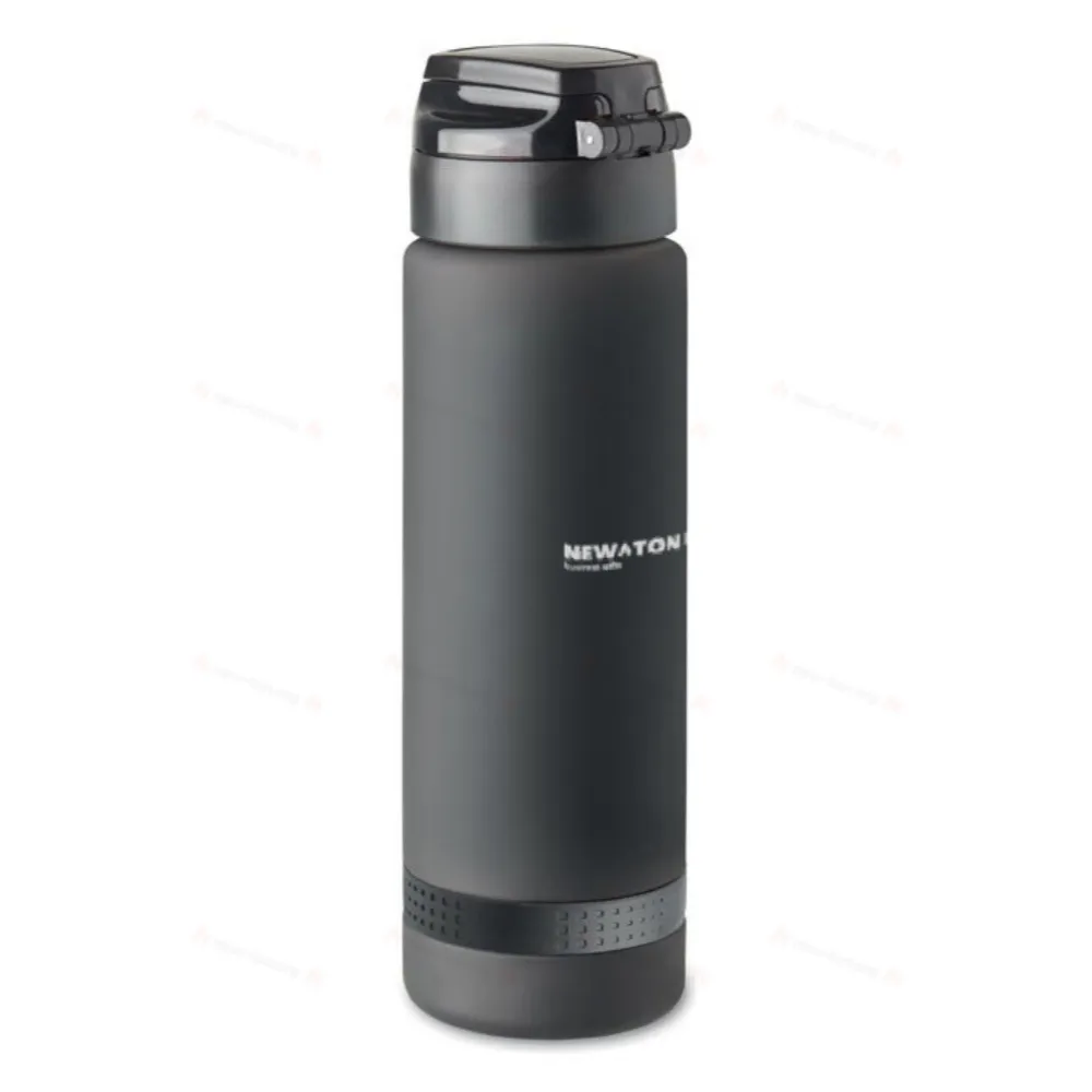 Спортивная бутылка для воды из переработанного пластика с разметкой, регулирующей потребление жидкости, откидной крышкой, замком безопасности и ремешком для переноски. Вместимость: 1 л.