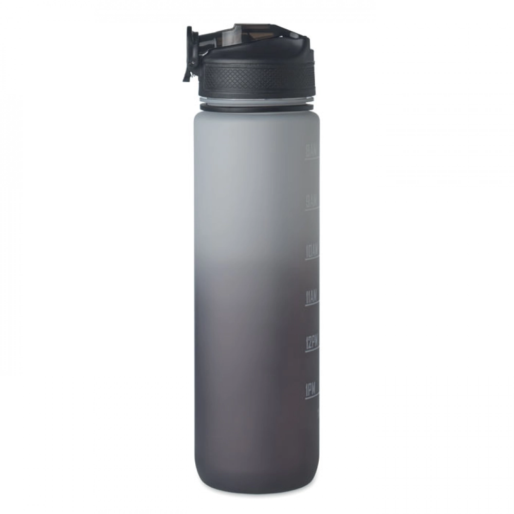 Sports water bottle in RPET with integrated straw, soft silicone mouth piece, motivational time markings, one hand opening flip top lid, safety lock and carrying strap. Capacity 1L.