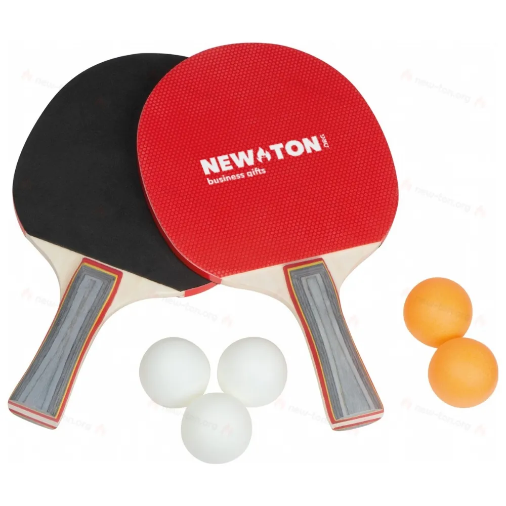 Набор для пинг-понга, упакованный в картонную коробку. В набор входят 2 ракетки, 3 белых и 2 оранжевых мяча.