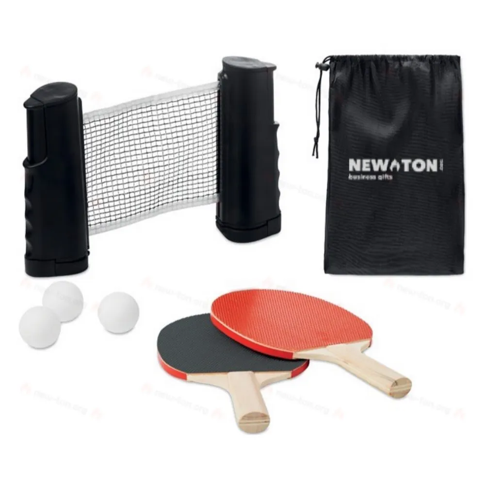 Набор для настольного тенниса с сеткой. Включает 3 мяча, 2 ракетки и 1 раздвижную сетку в чехле из RPET.