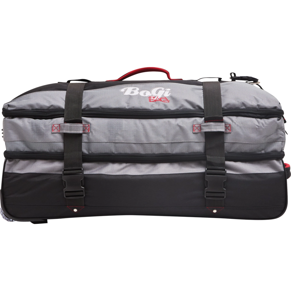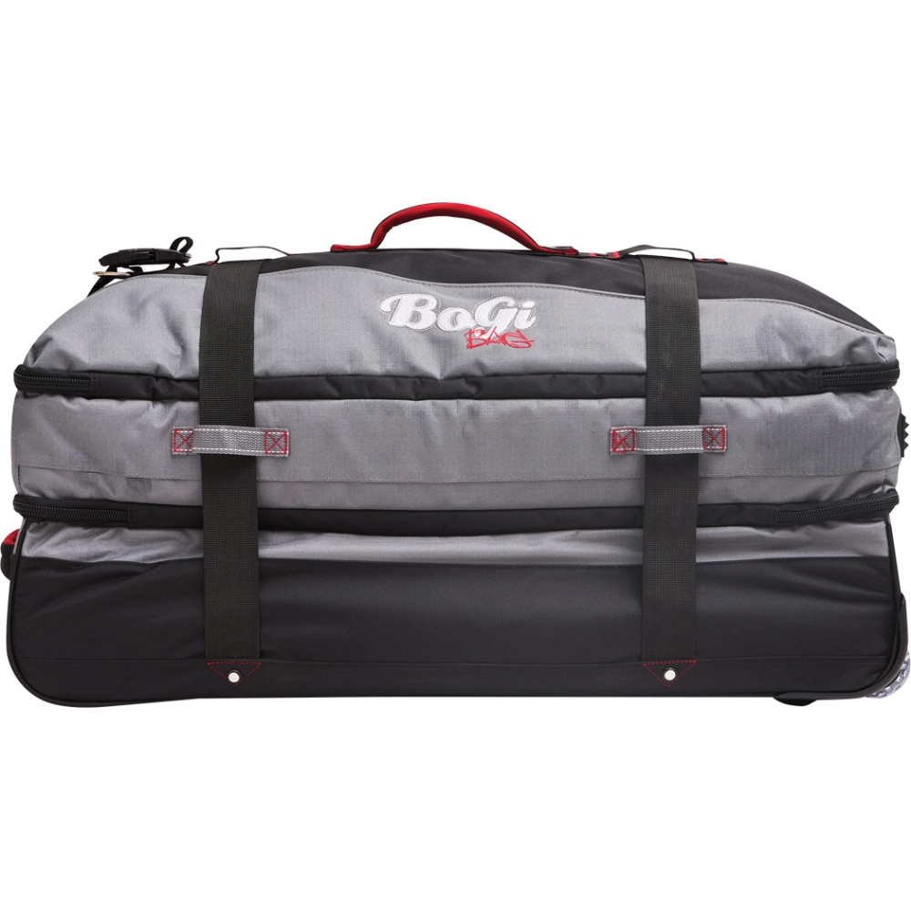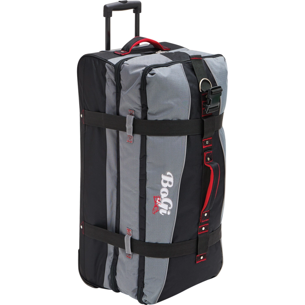 Сумка-тележка для путешествий BoGi XL: отдельные уровни упаковки с молнией, основное отделение с 2 перегородками, 1 сетчатый карман на одной из перегородок, 2 внутренних кармана с молнией, 2 подушечки для переноски, выдвижная система тележки, 2 компрессионных ремня с застежкой на боковой пряжке, отделение для адреса на задней стороне, плавно скользящие колеса с защитными уголками, 2 рельсы для защиты от ступеней, ножки внизу, встроенный кодовый замок.