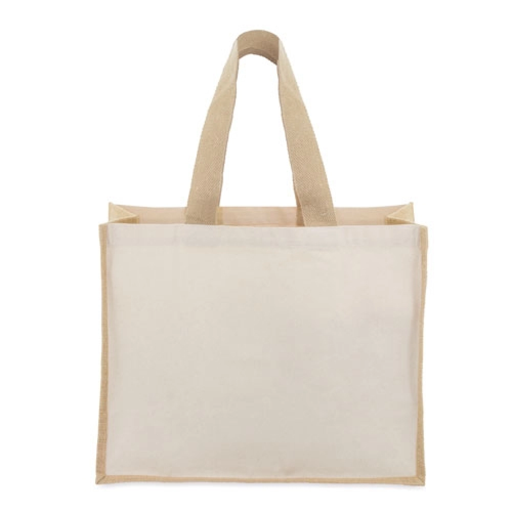 Сумка из хлопкового холста с ручками, боковые части из натуральной джутовой ткани. Двойная ручка, внутренний карман и широкое дно. Размер внутреннего кармана: 15 x 11 см. Размер ручки: 52,5 x 4,5 см.