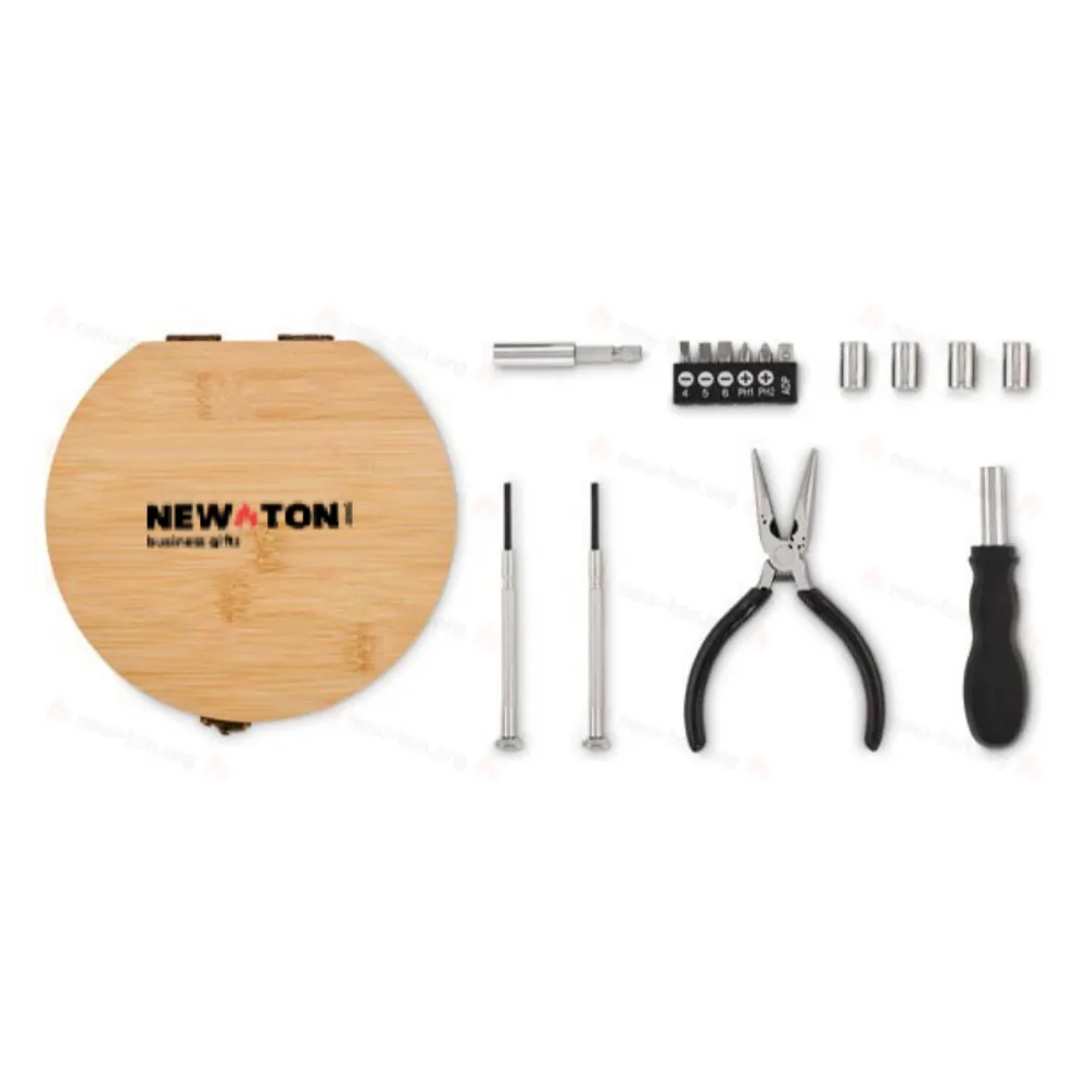 Набор инструментов в бамбуковом футляре: 6 отверток в держателе, 3 шлицевых, 2 размера Philips (PH1, PH2) и 1 адаптер, 4 гнезда, 1 рукоятка, 1 соединитель, 1 плоскогубцы и 2 высокоточные прецизионные отвертки. FSC®-certified | FSC 100%, N5.7, FSC-C213206