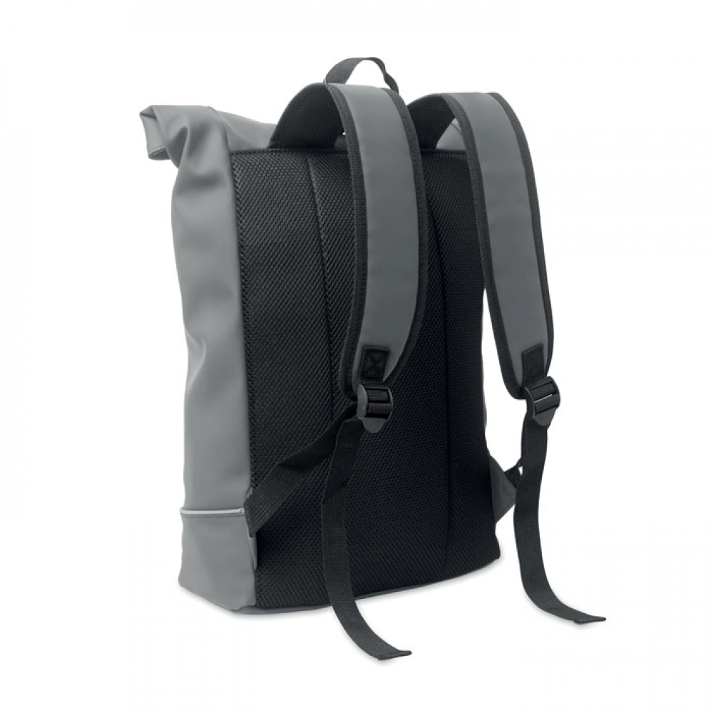 15 inch roll top laptop backpack in soft PU with padded back and base reinforcement with reflective strip. Waterproof zippered front pocket. 210D RPET polyester lining.