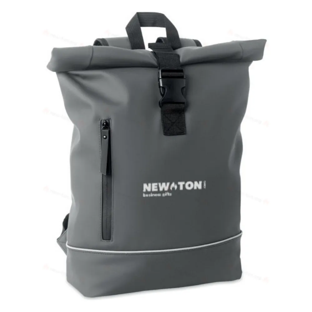 Рюкзак с откидным верхом для ноутбука 15 дюймов, выполненный из мягкого PU-материала, с мягкой спинкой и усиленным дном, оснащённый светоотражающей полосой. Водонепроницаемый карман на молнии спереди. Подкладка из полиэстера 210D RPET.