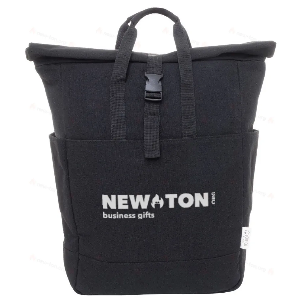 Рюкзак из переработанного хлопкового холста с роликовым верхом, застежкой на пряжку и липучкой, отделением для ноутбука (15 дюймов), передними и боковыми карманами. С ремешком для тележки, подкладкой на спине и плечевыми ремнями. С характерным ярлыком из переработанного хлопка.