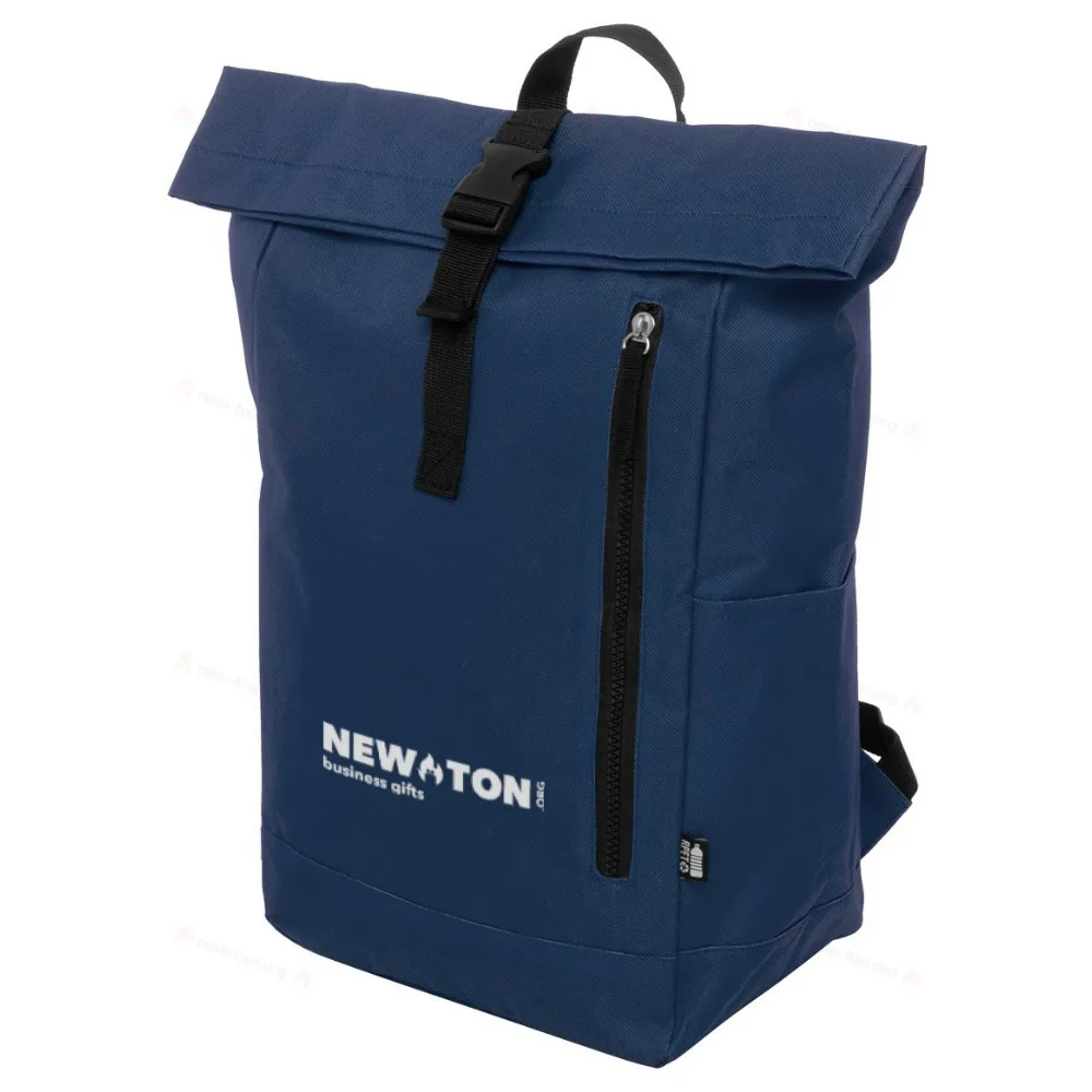Рюкзак с застежкой на пряжке, отделением для ноутбука (14 дюймов) и карманом на молнии. С мягкой спинкой и плечевыми ремнями. Изготовлен из 600D RPET полиэстера с характерным ярлыком RPET.