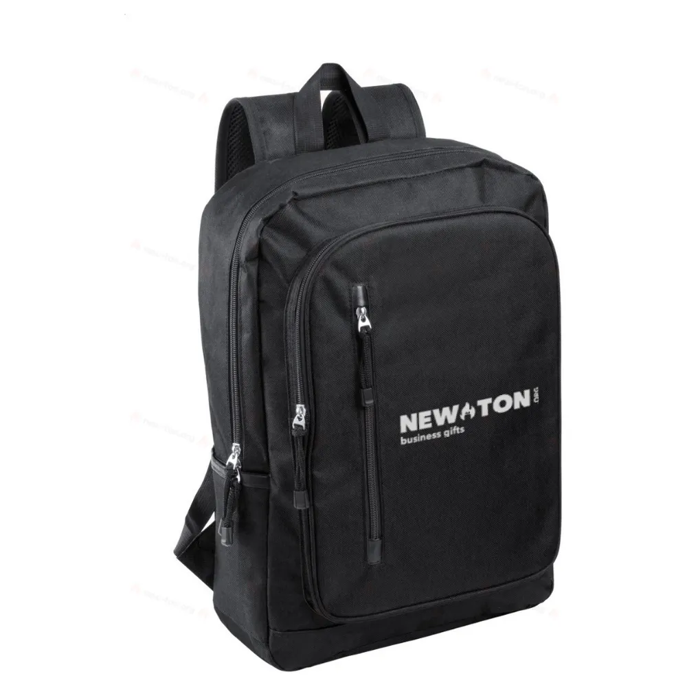 Рюкзак с застежкой на молнии основного отделения, 2 передних кармана на молнии, боковые карманы и отделение для ноутбука (15") с подкладкой. С мягкой спинкой и плечевыми ремнями. Полиэстер RPET 600D, с характерным ярлыком RPET.