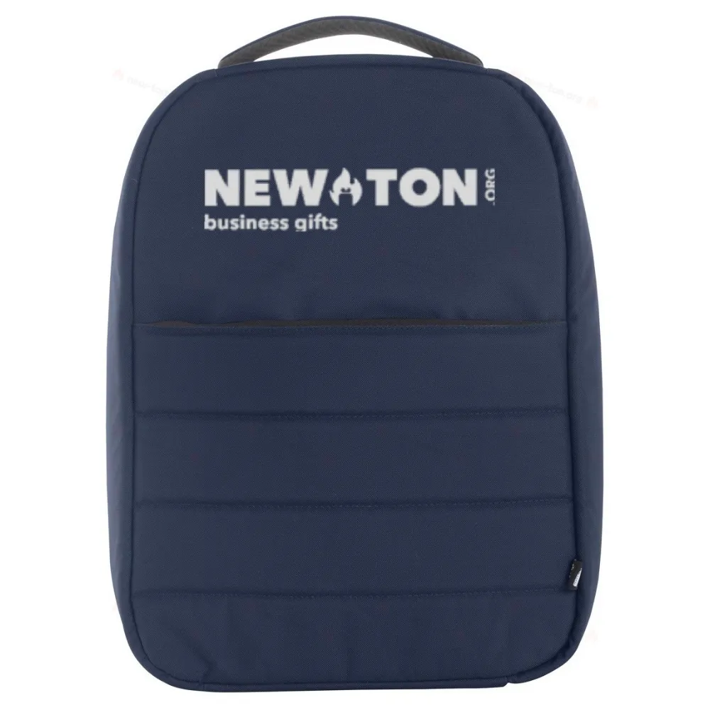 Полностью обитый рюкзак из RPET с застежками-молниями, отделениями для ноутбука (15") и планшета (12"), ремешком для тележки, эргономичной спинкой и плечевыми ремнями. Со скрытым карманом от краж. Полиэстер RPET 300D. С характерной этикеткой RPET.