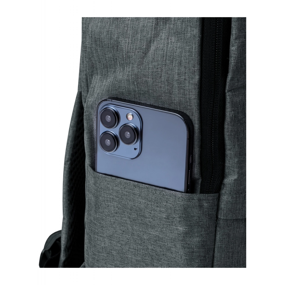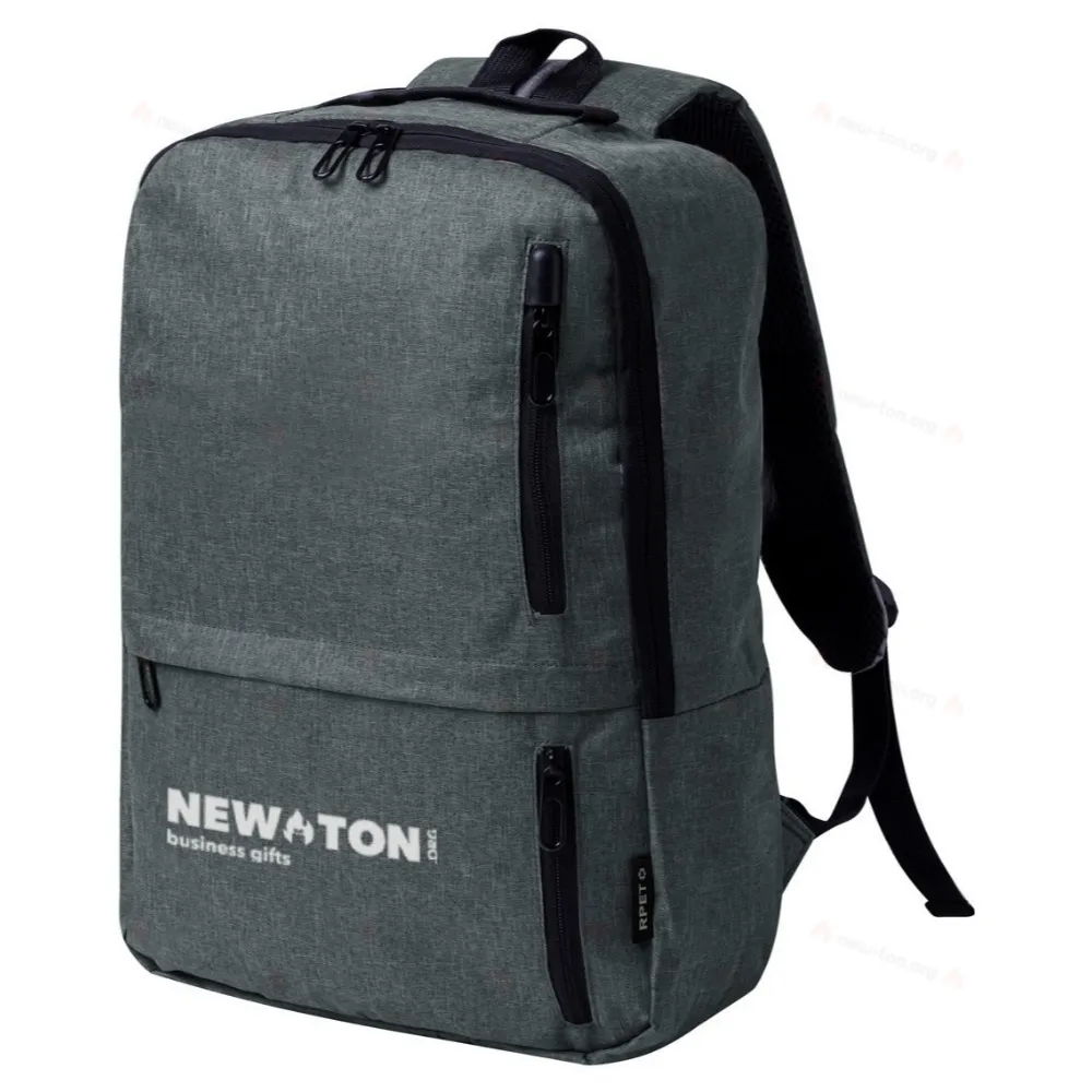 Рюкзак с застежками на молнии, отделениями для ноутбука (15") и планшета (10"), мягкой спинкой и плечевыми ремнями. 600D RPET полиэстер с характерным ярлыком RPET.