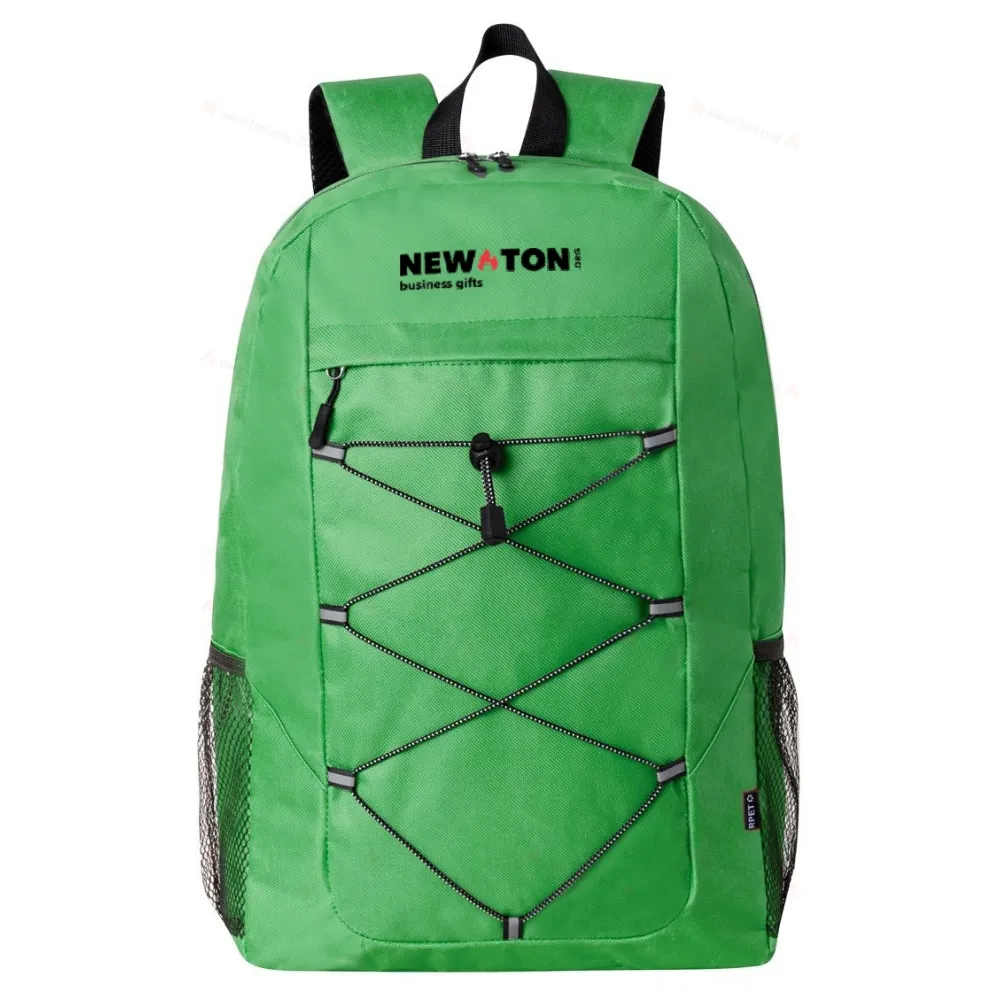 Рюкзак с застежкой на молнии и передним карманом, сетчатыми боковыми карманами, подкладкой на спине и плечевыми ремнями. 600D RPET полиэстер с характерной этикеткой RPET.