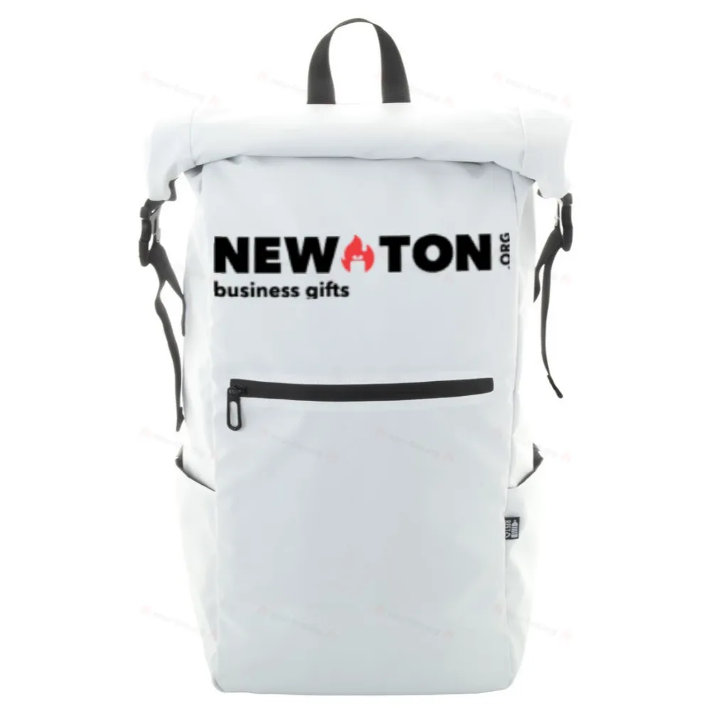 Водонепроницаемый рюкзак с закрытием на пряжку и липучку, изготовленный из RPET, с отделением для ноутбука (16") и планшета (10"), передним карманом на молнии, боковыми карманами, подкладкой на спине и плечевыми ремнями. Полиэстер RPET с покрытием PU 600D, с характерной этикеткой RPET.